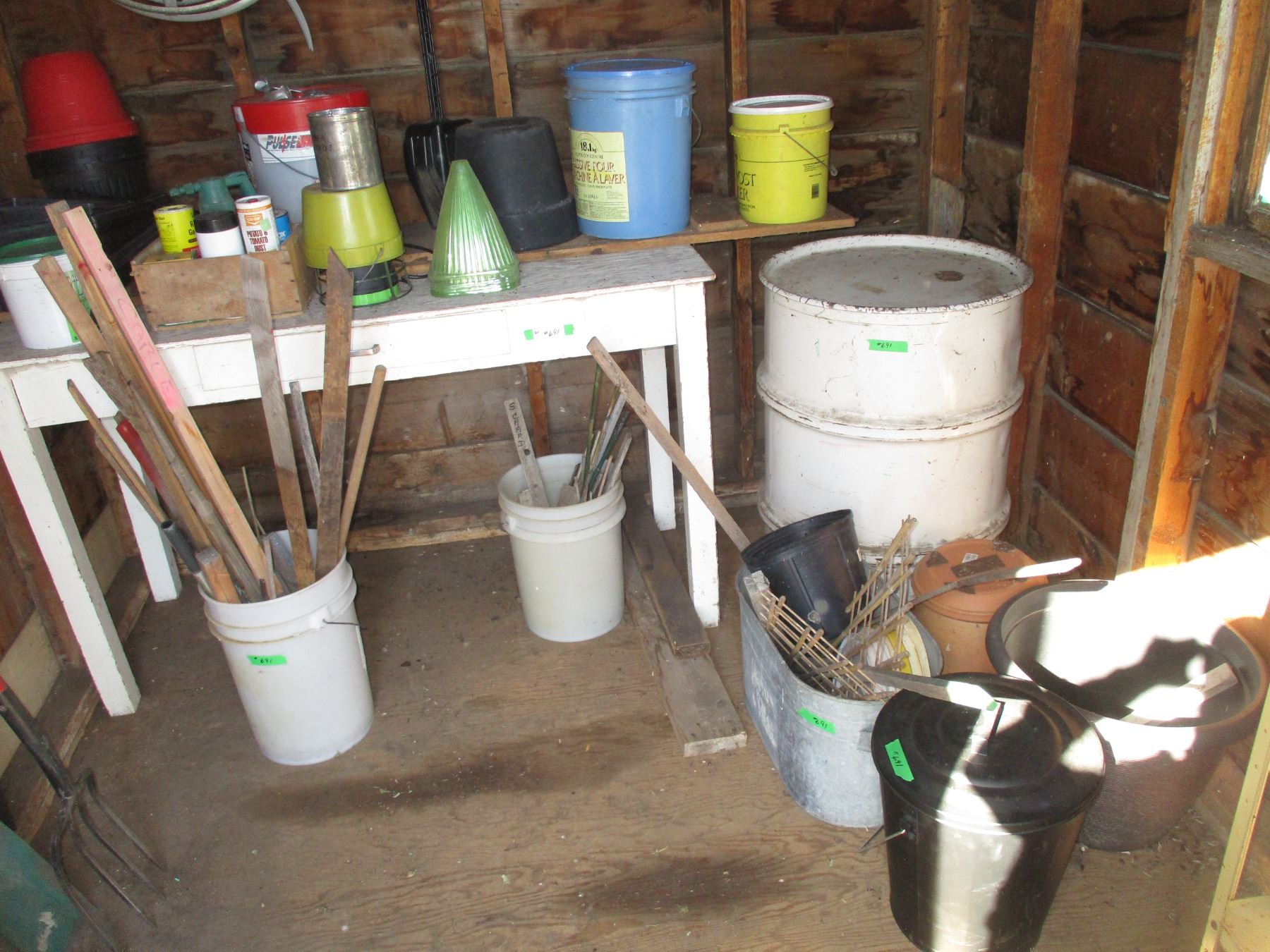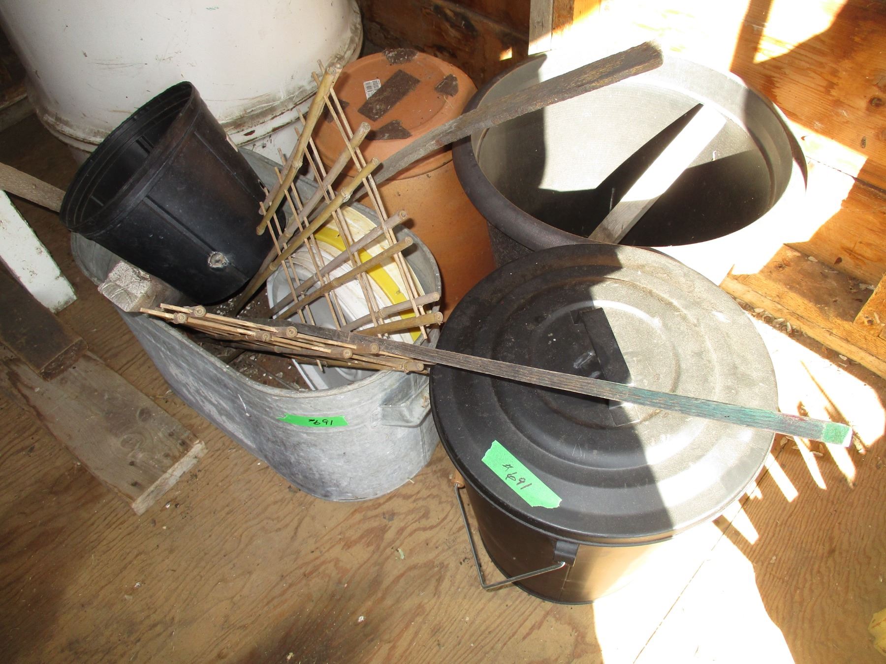 Wooden Table with Contents, Galvanized Tub & Barrel, Misc.