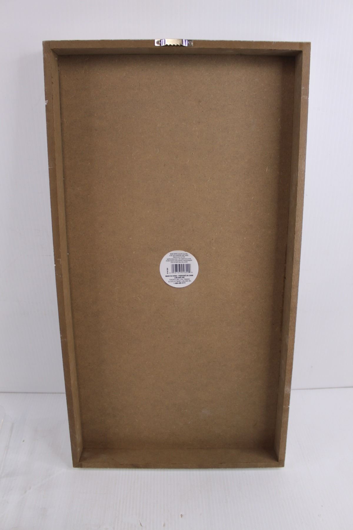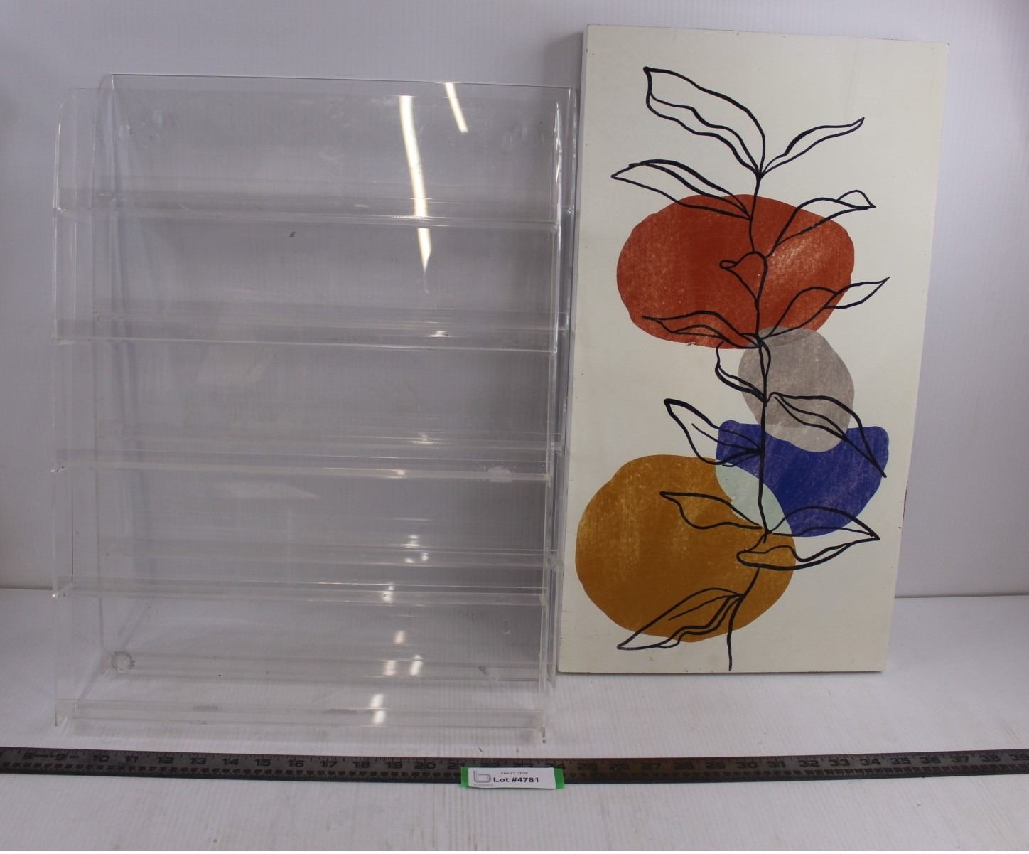 Wooden Wall Art 22" x 12" x 1.5", (2) Clear Plastic Wall Mountable Display Shelves 15.5" x 20" x 2"
