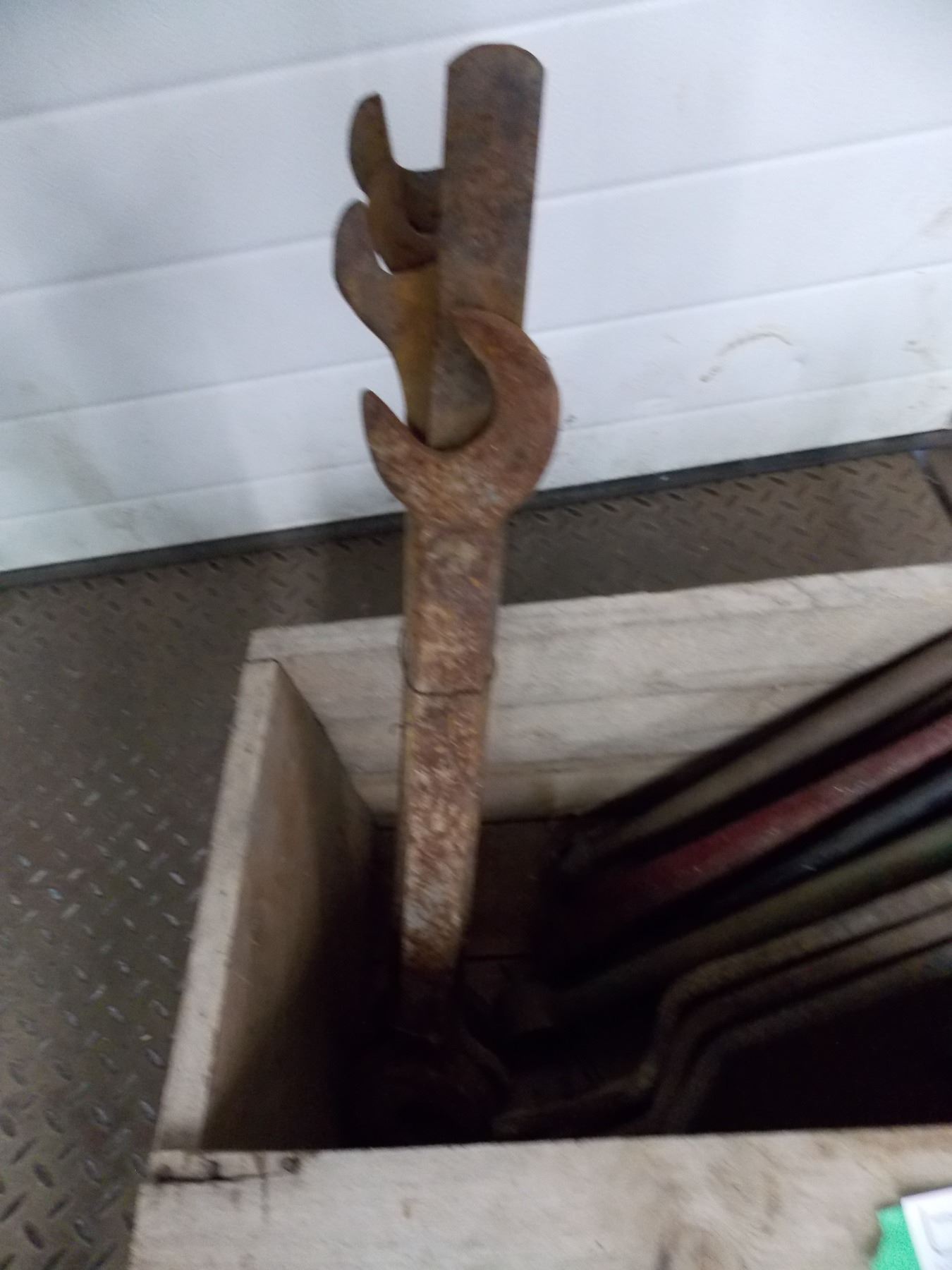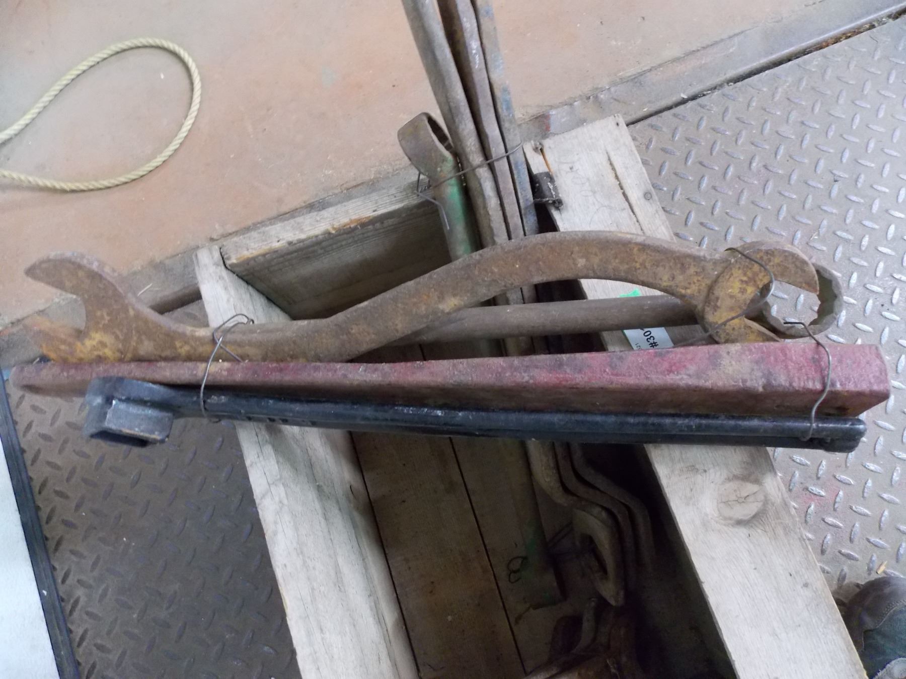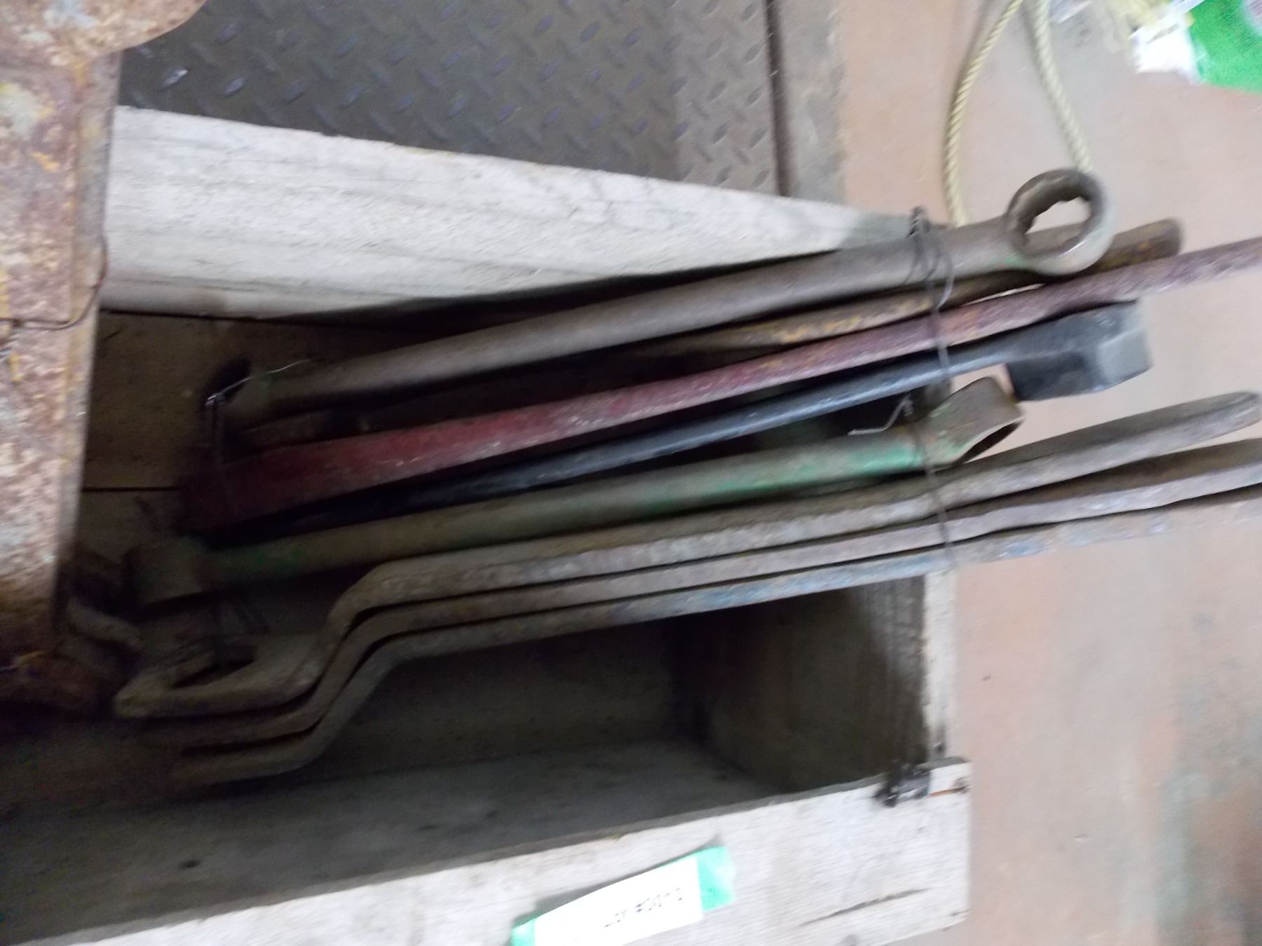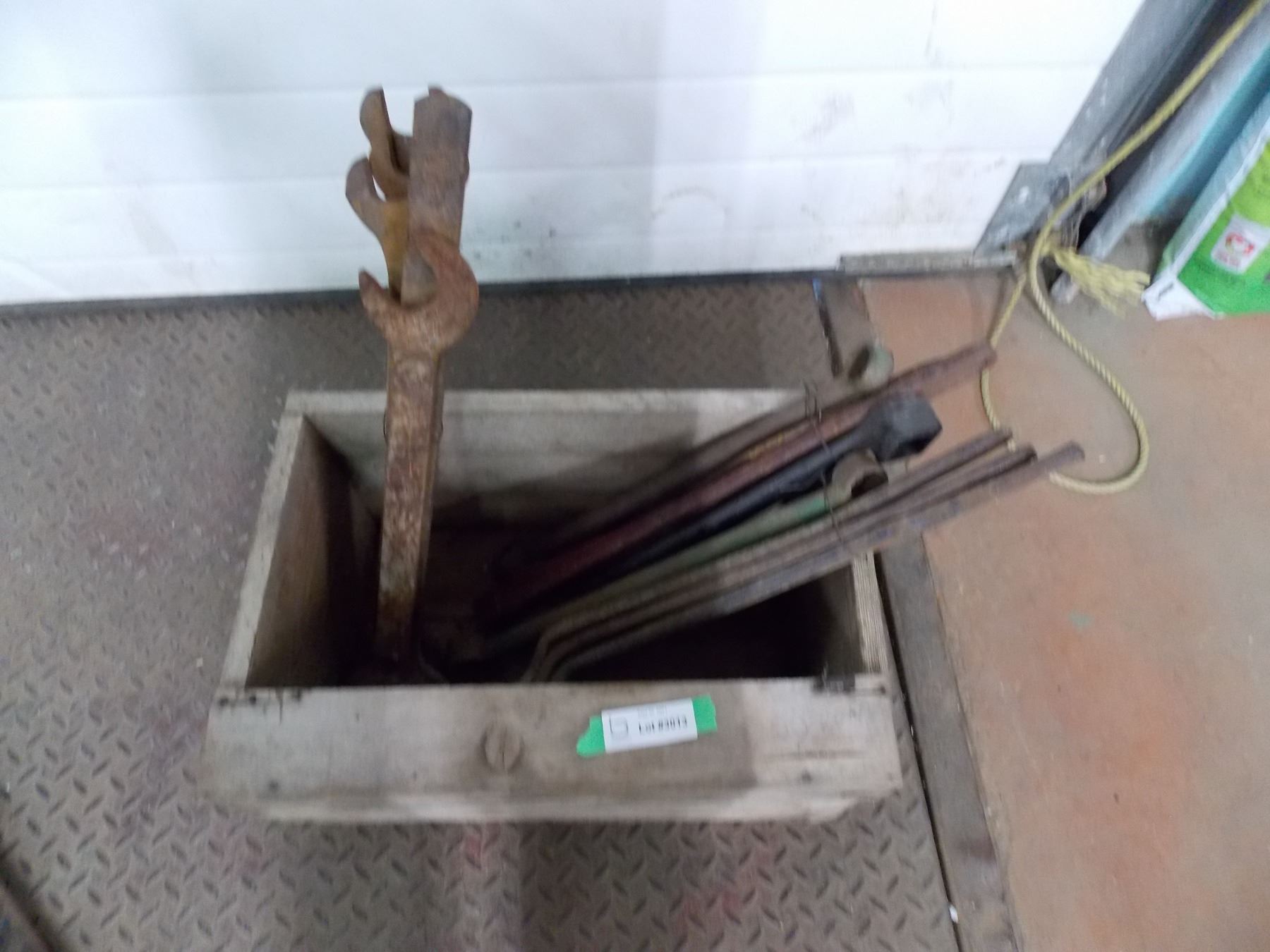Wooden crate with vintage John Deere Tractor wrench and other large steel tools