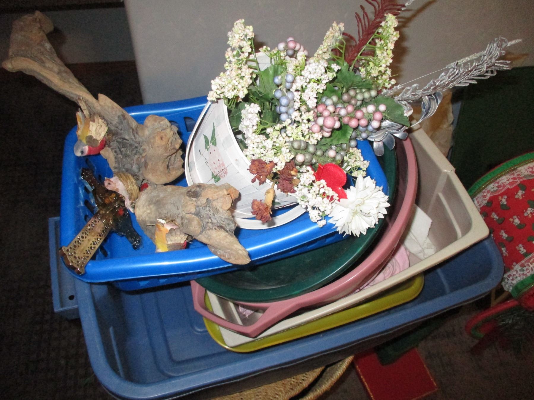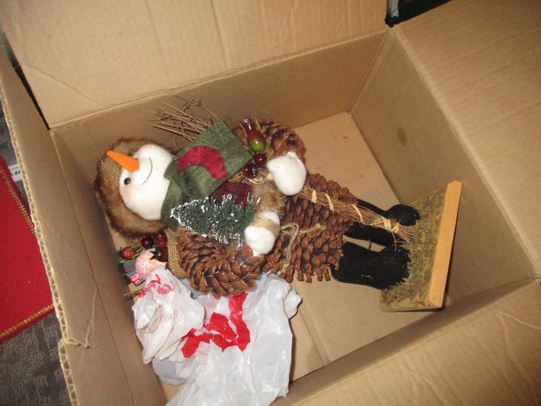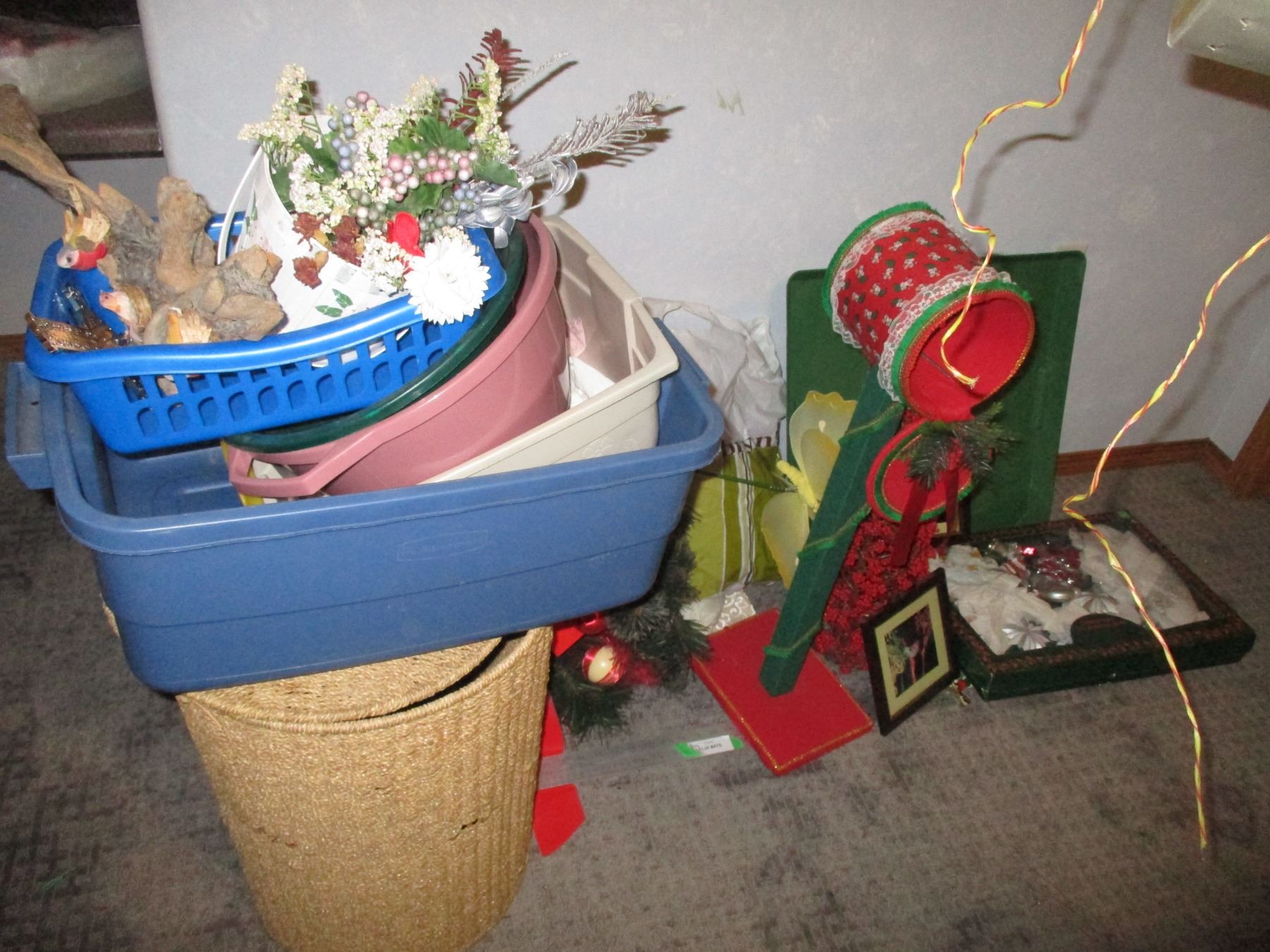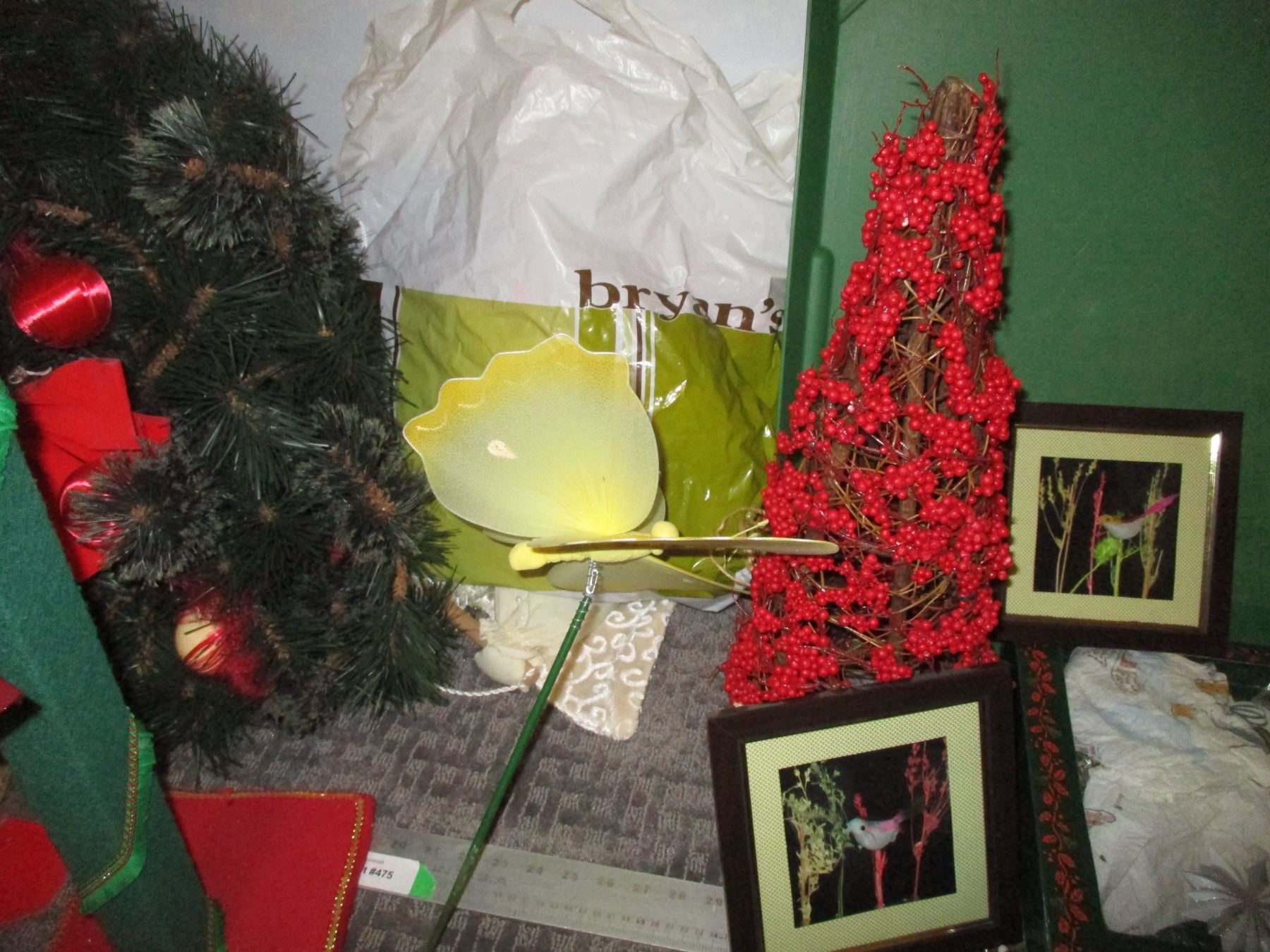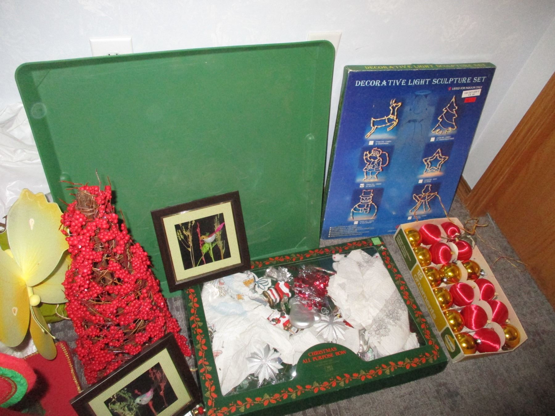 Wreath, Ornamental Christmas Tree, (2) Bird Picture Frames, Bows, Snowman Ornament, Ball Ornaments, Christmas Mail Box, Wicker Hamper With Lid, Totes, Artificial Flowers, etc.