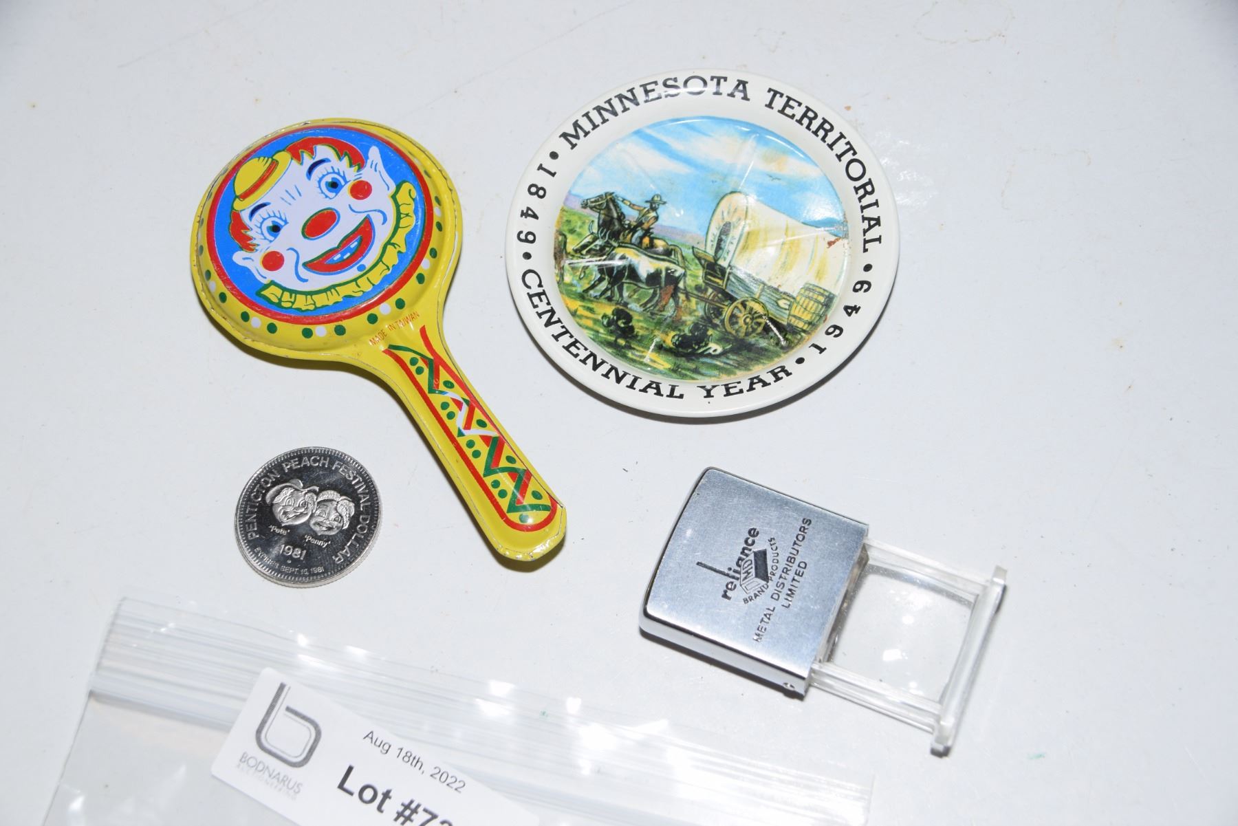 Zippo magnifying glass, tin shaker toy, plate, souvenir coin