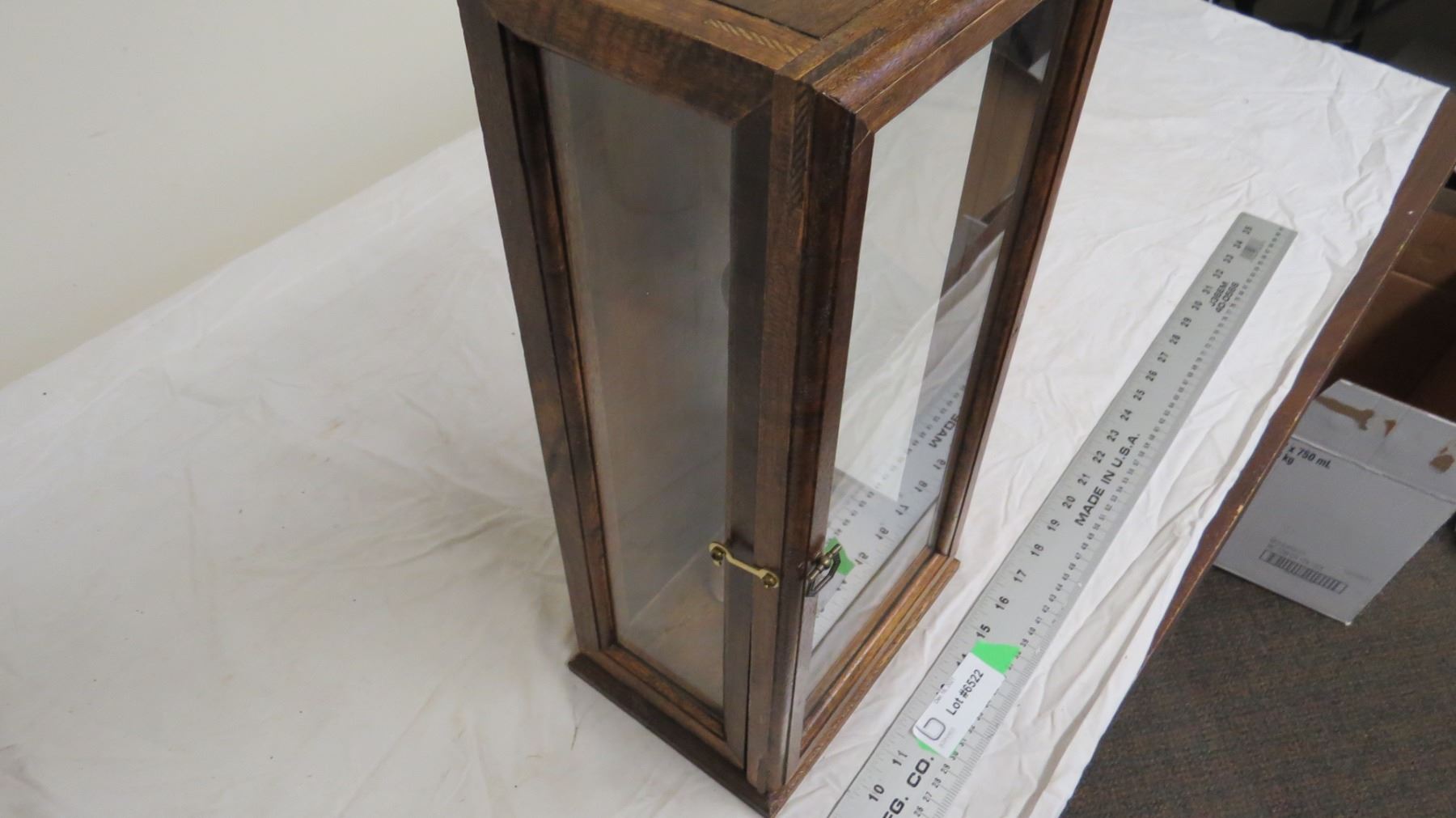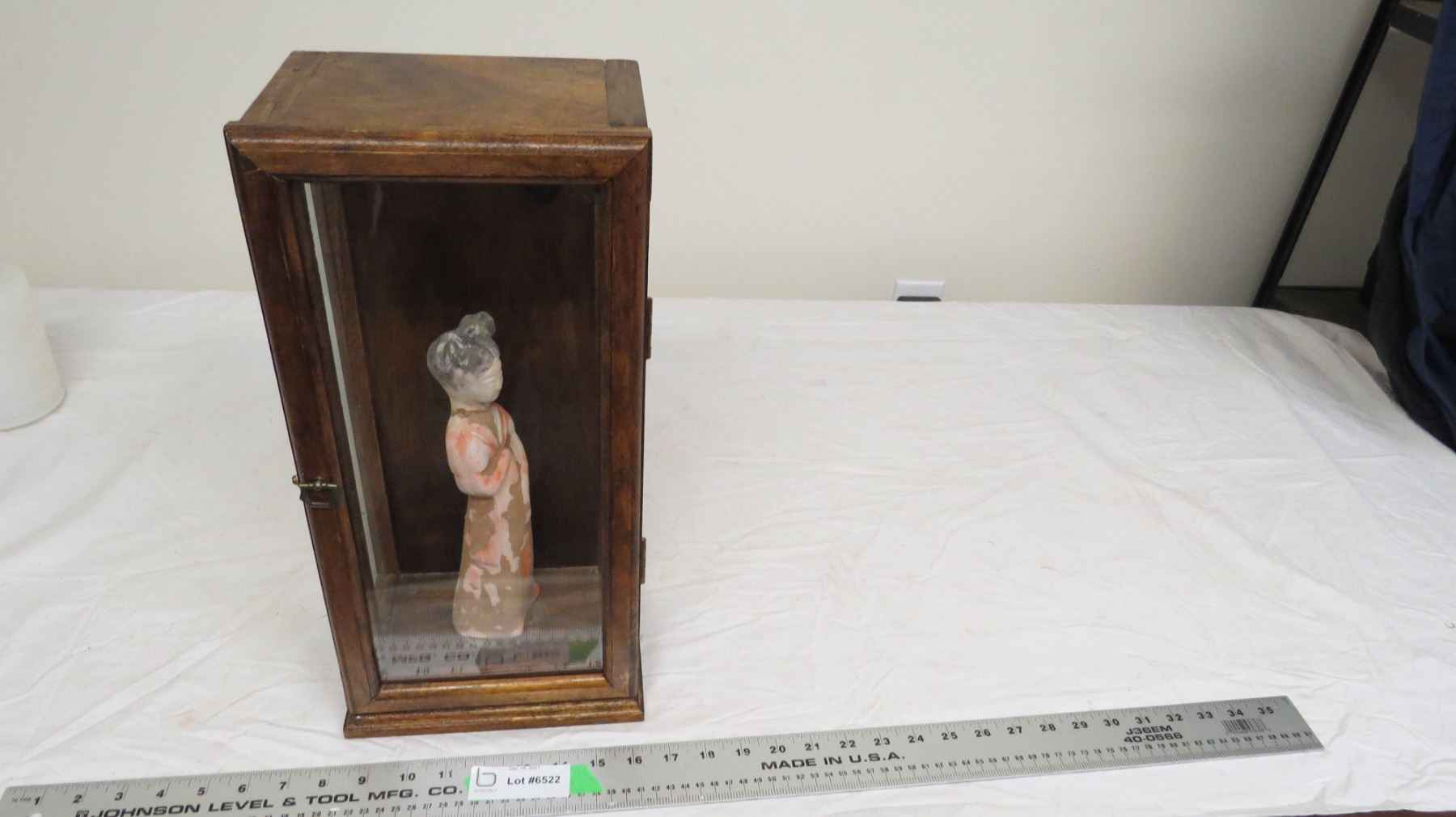 antique asian relic in framed wooden glass case - 17" tall case