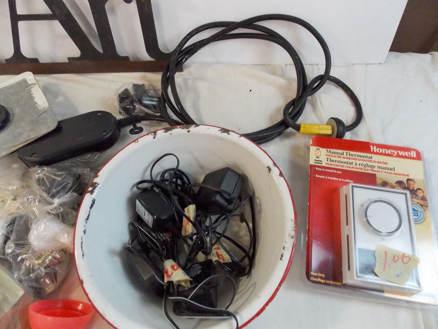 *box of household related, home repair, knobs, outlets, electronic timers, wrenches, vintage philish