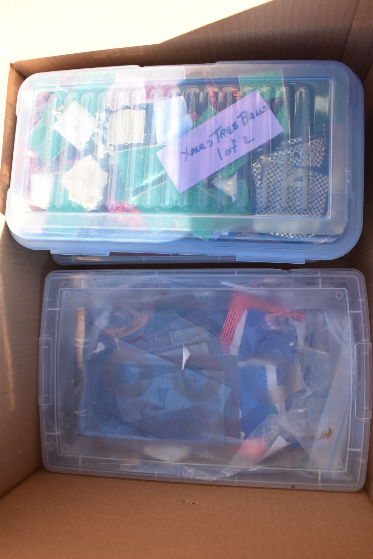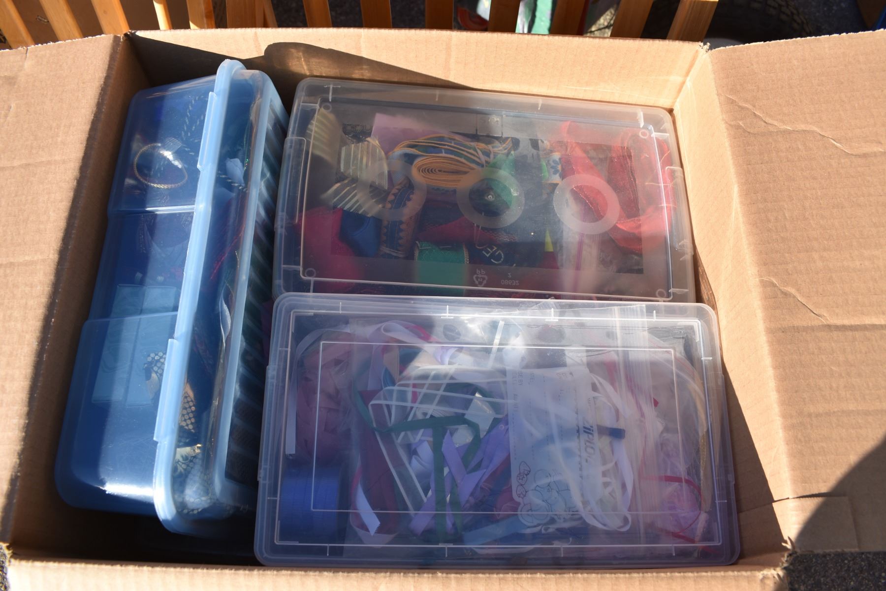 box of sewing materials (ribbon pieces)