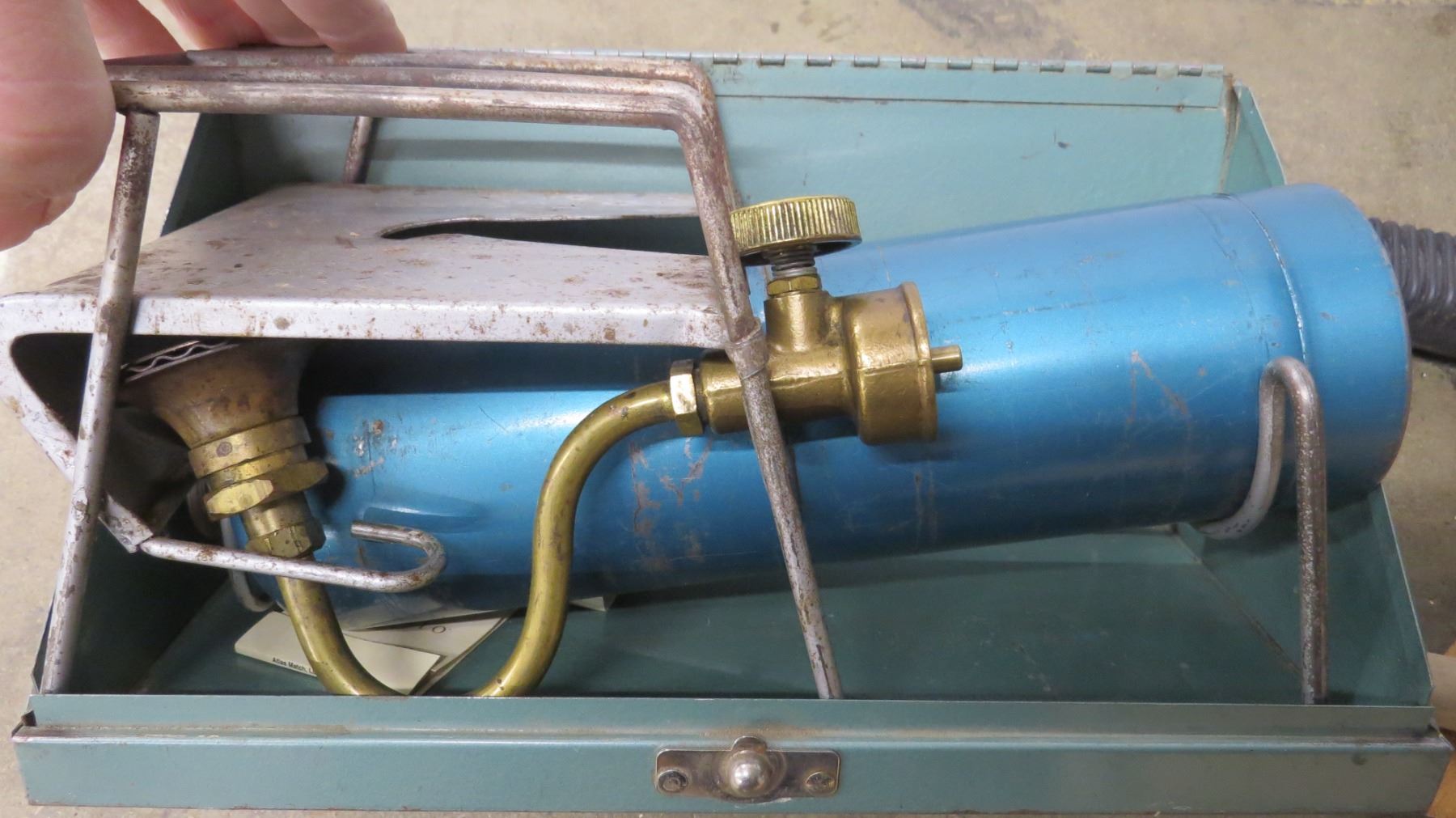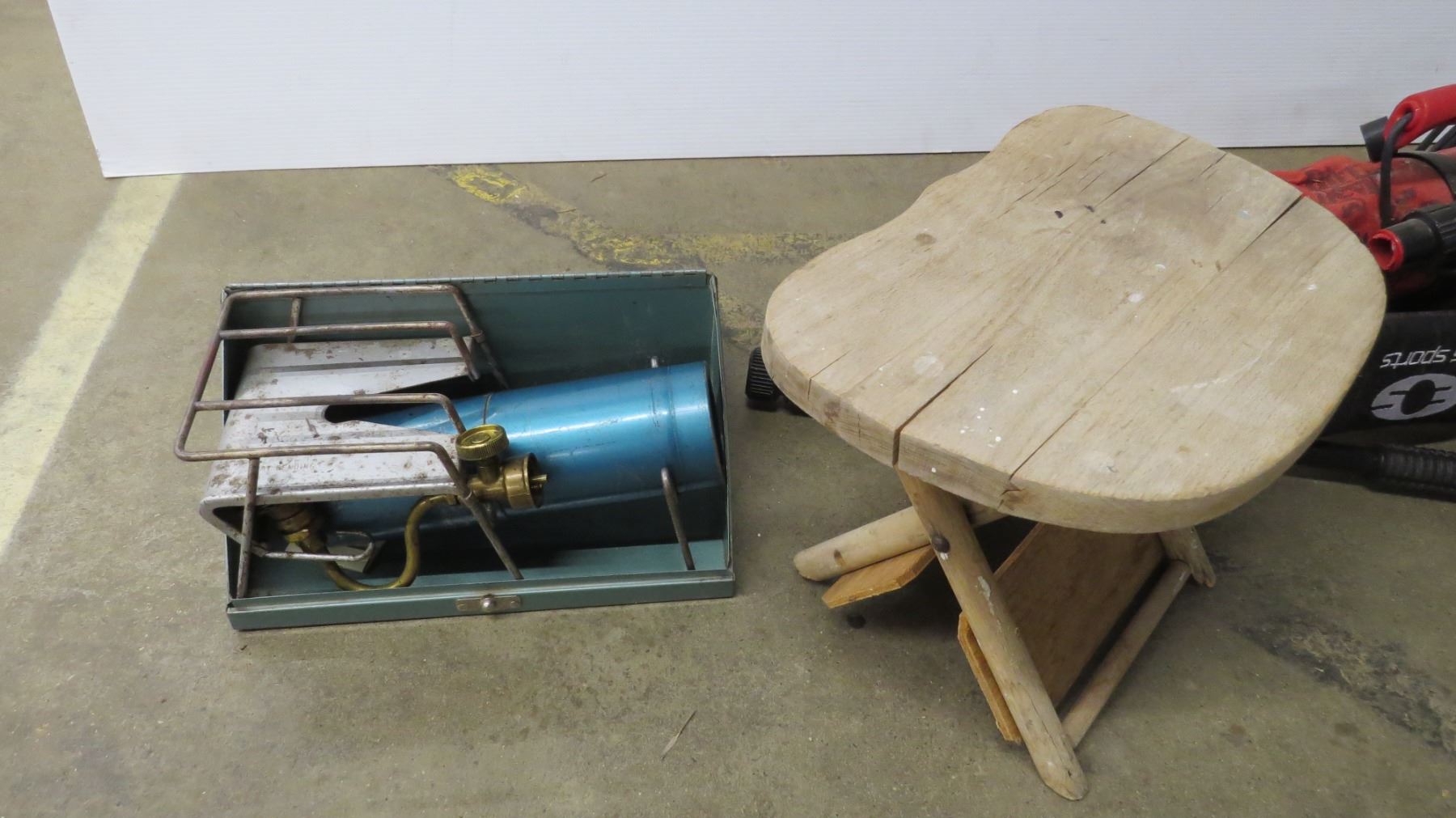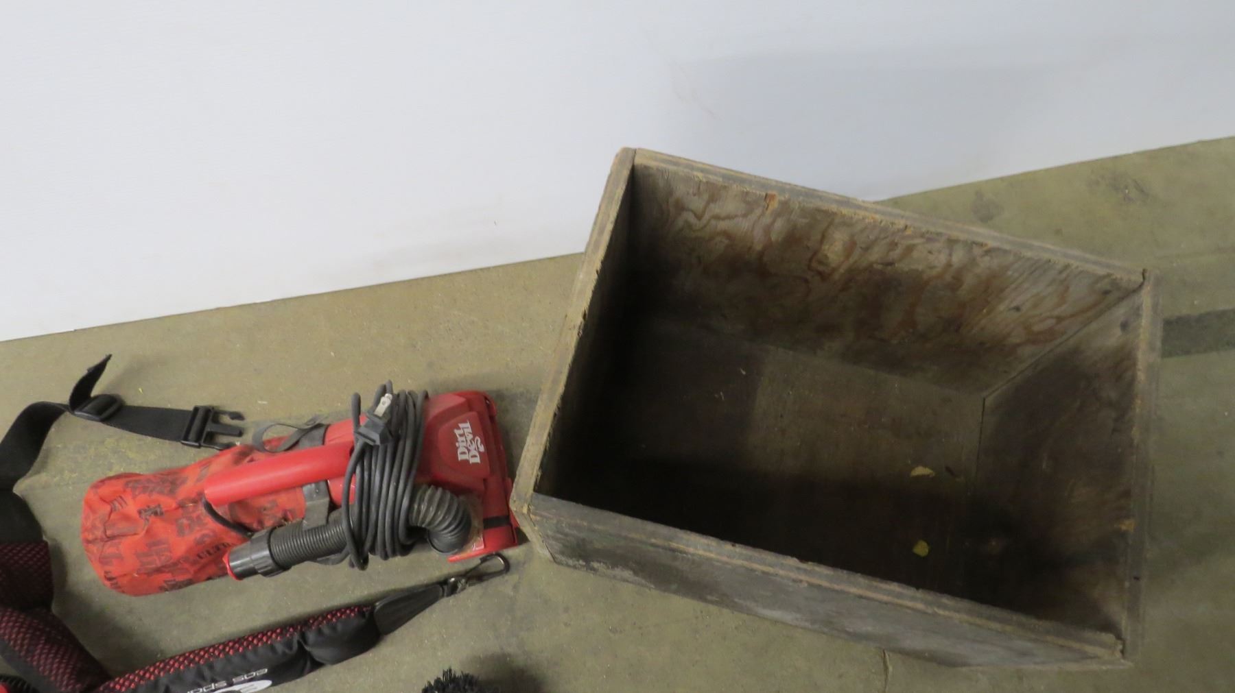 dirt devil vacuum (working), turner camp stove, wooden crate, misc