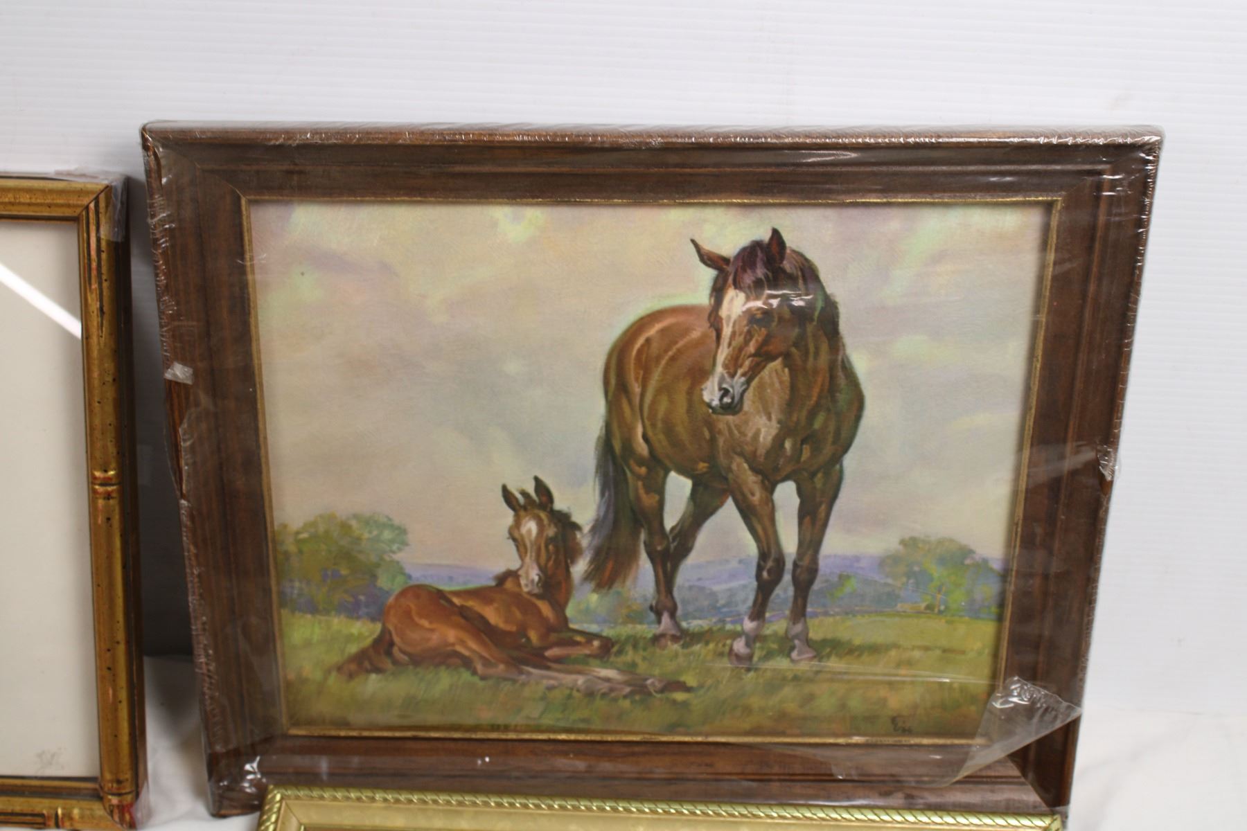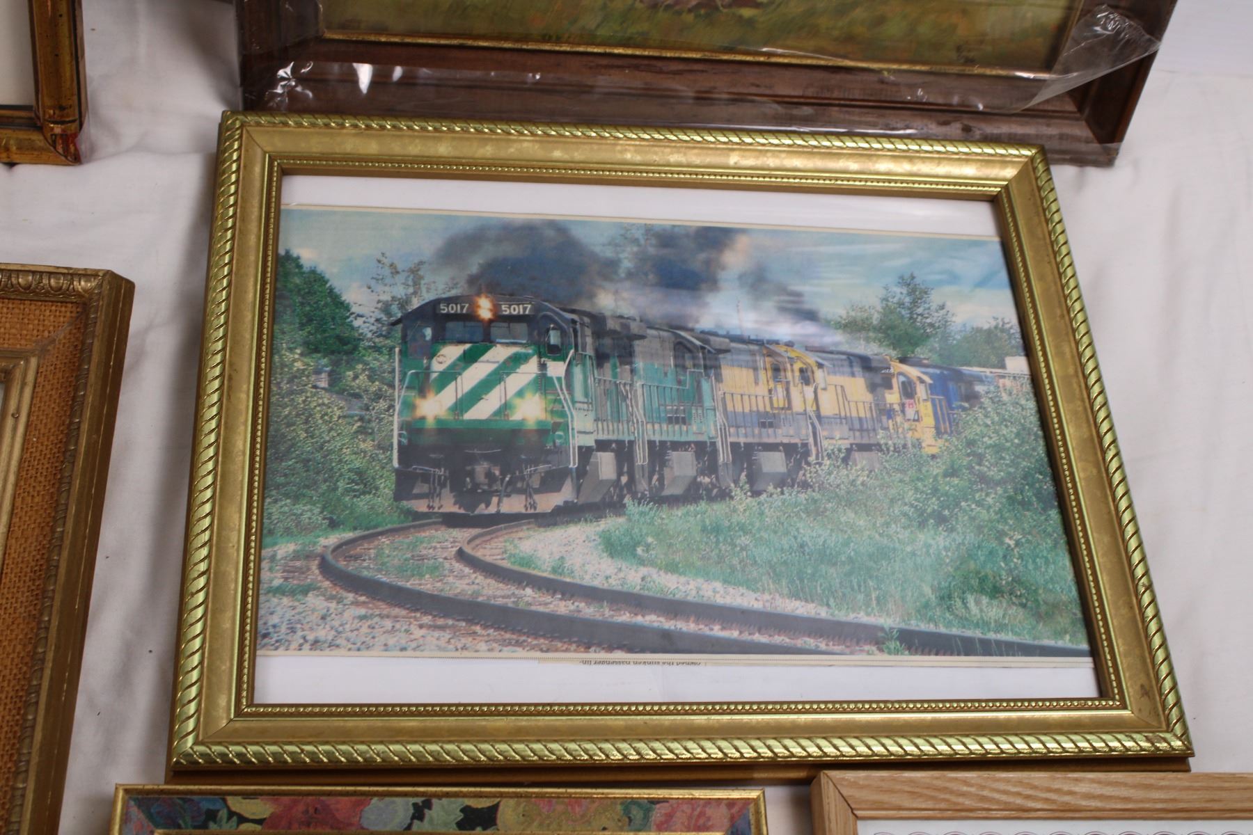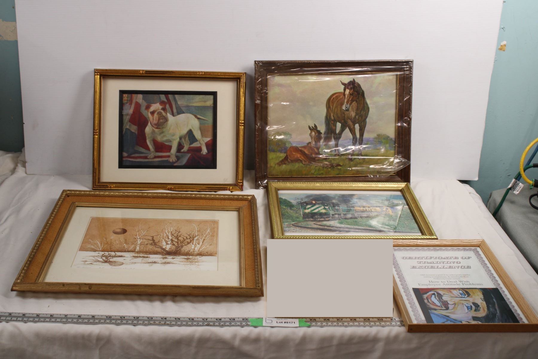 framed pictures, train(newpaper clipping?) horse painting (by Elmore Brown), bulldog print, swamp pi