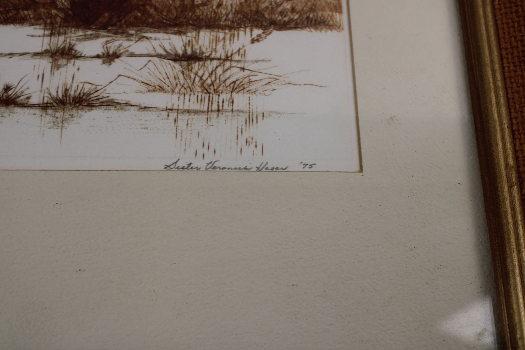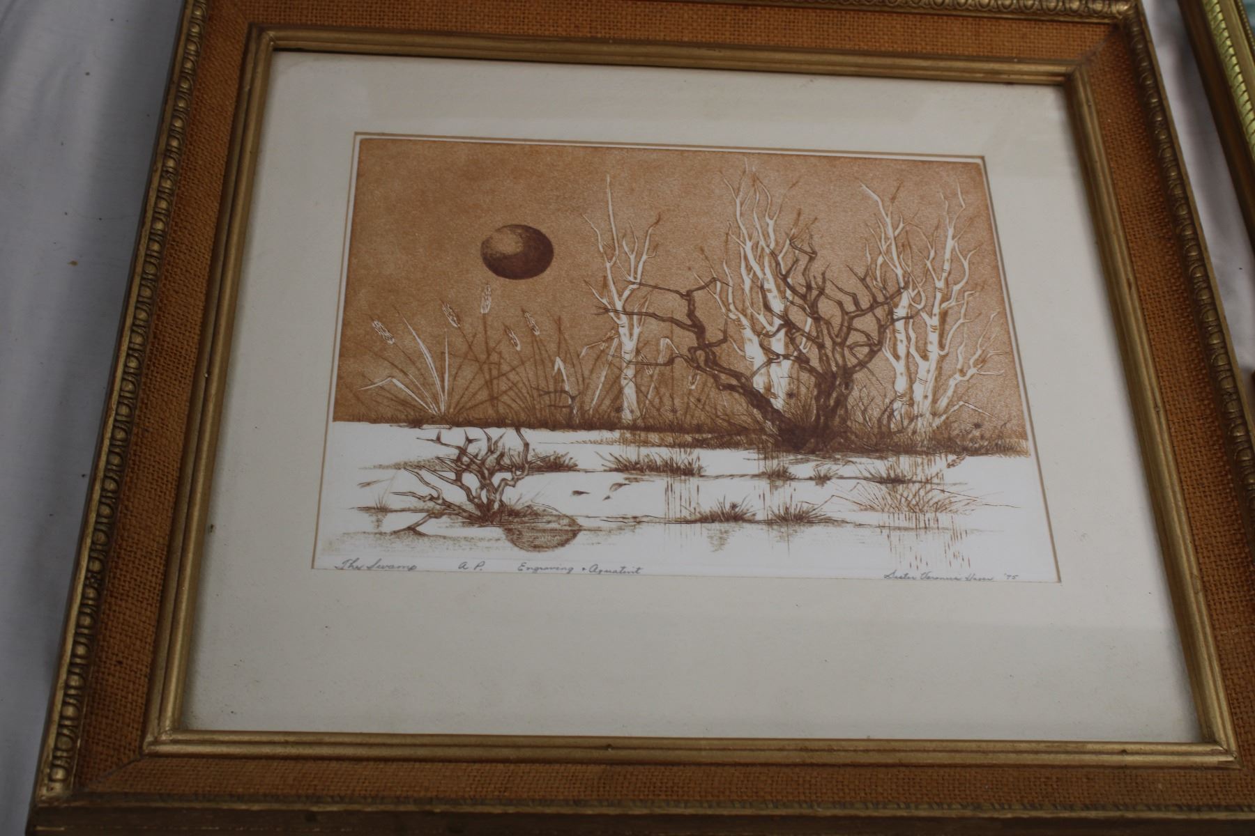 framed pictures, train(newpaper clipping?) horse painting (by Elmore Brown), bulldog print "what we have we'll hold", swamp picture (1975)