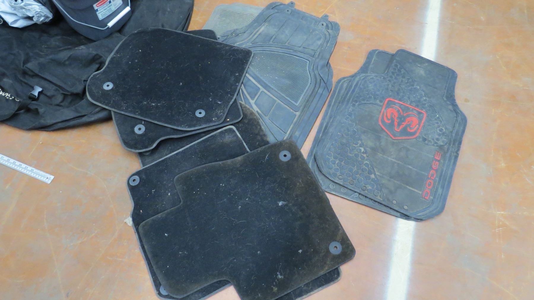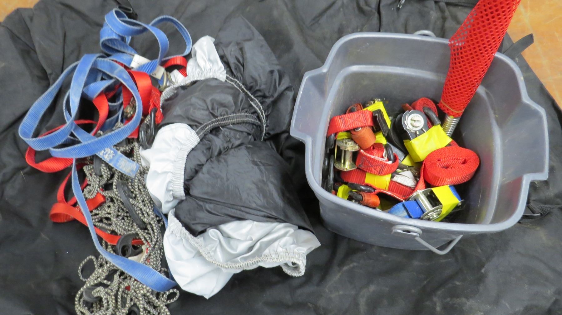 large cargo bag, tie down straps, floor mats
