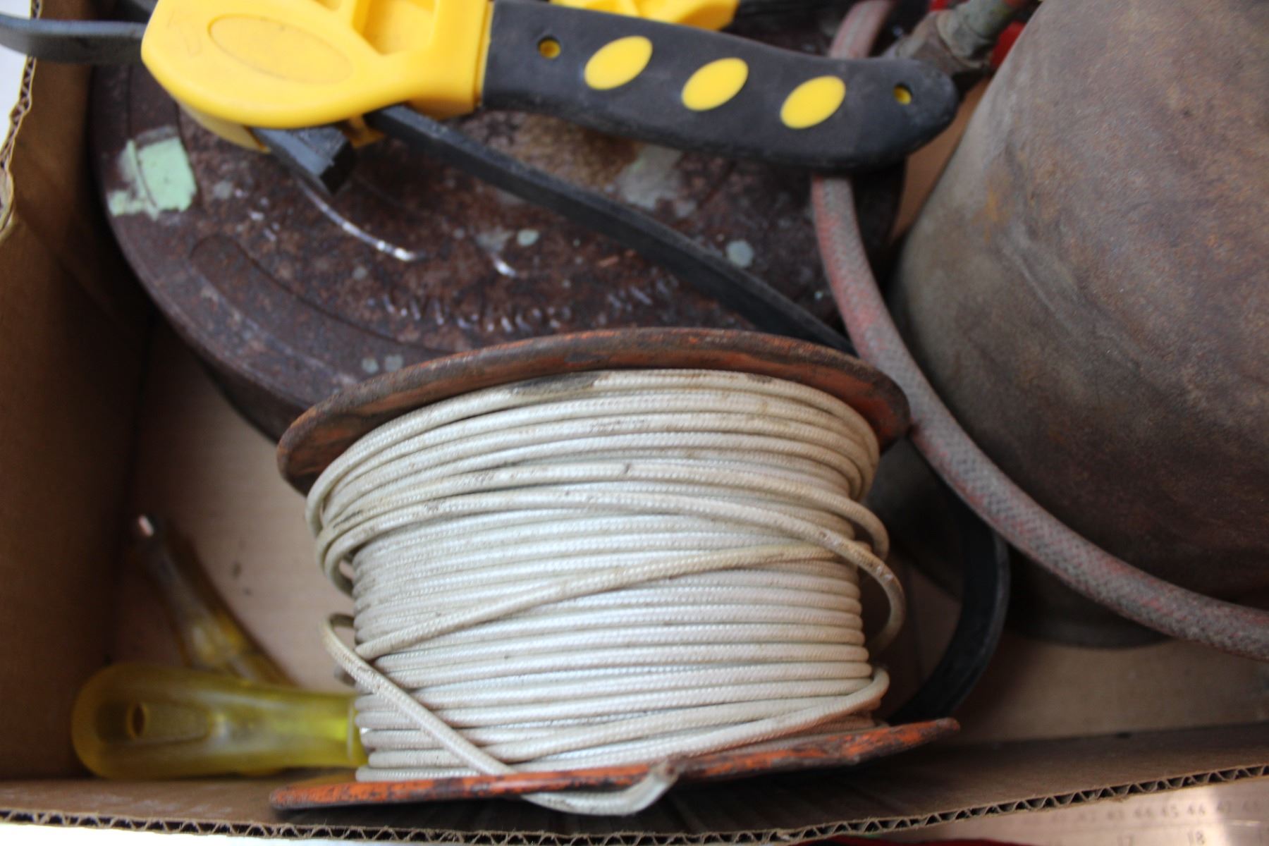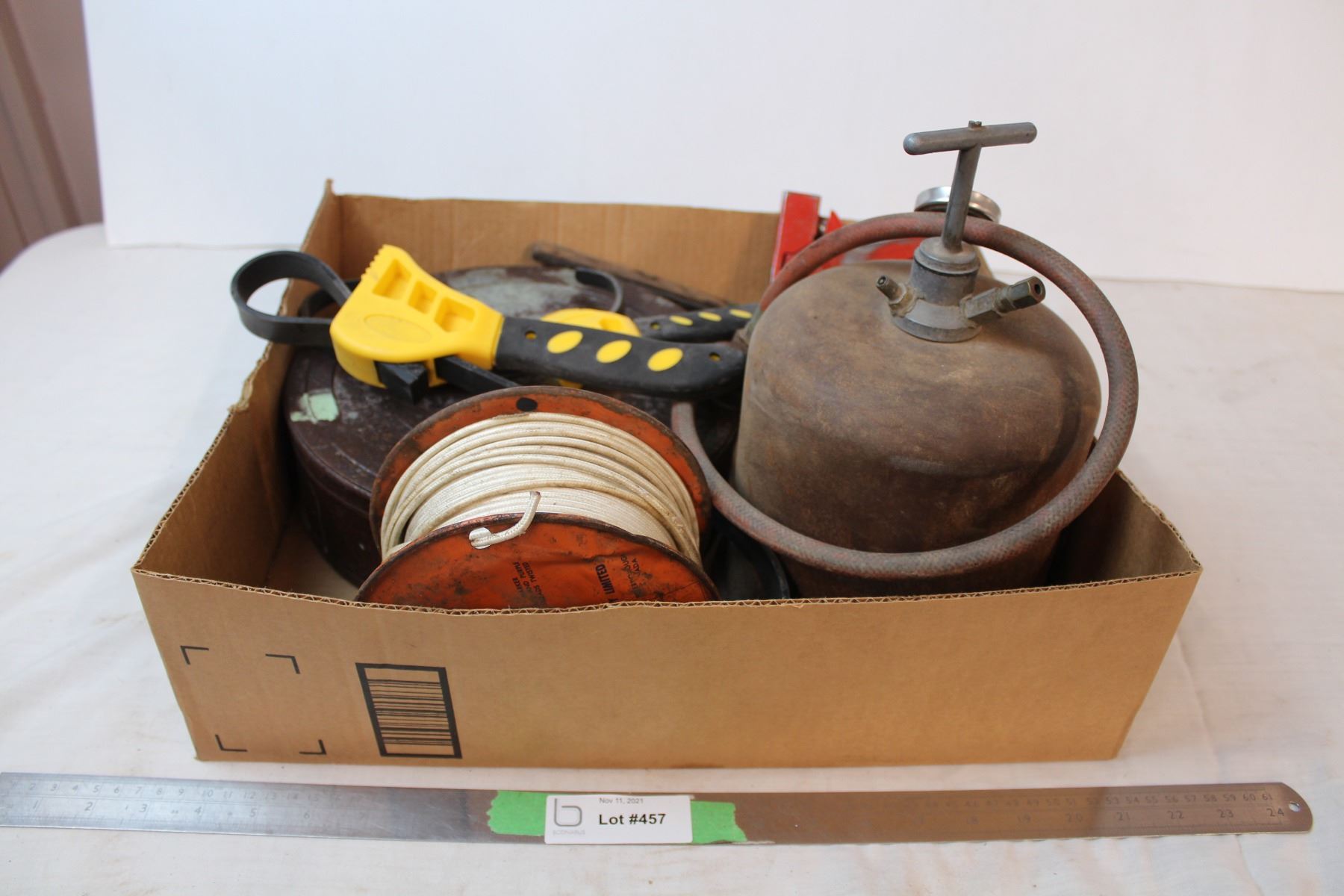 misc. Garage items; filter wrench, staple gun, vintage film reel container
