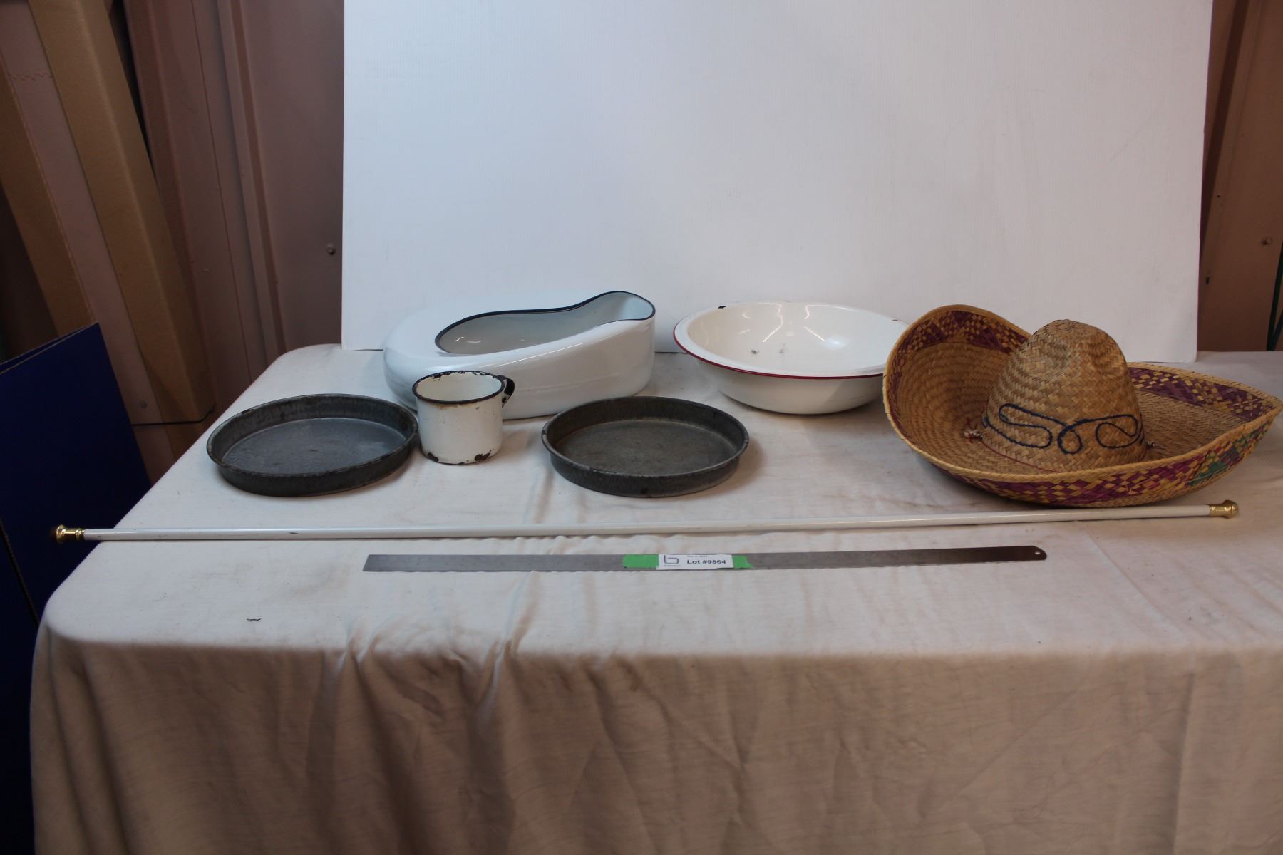 *misc. Items; Vintage bed pan, sombrero, enamal mug