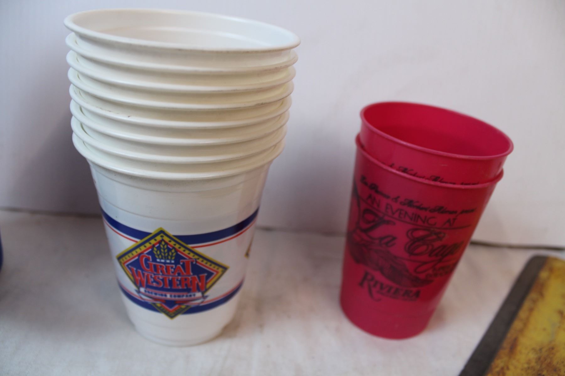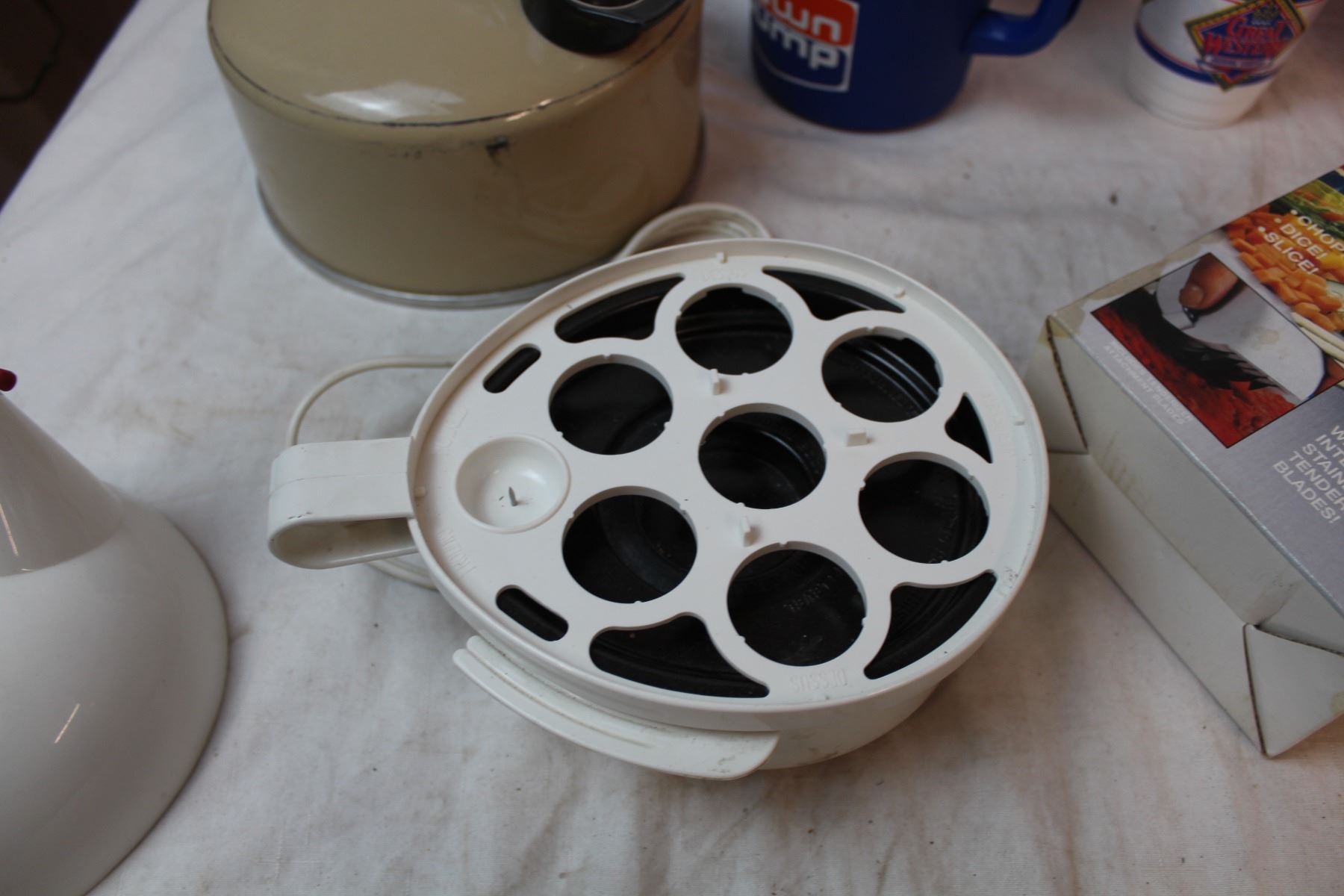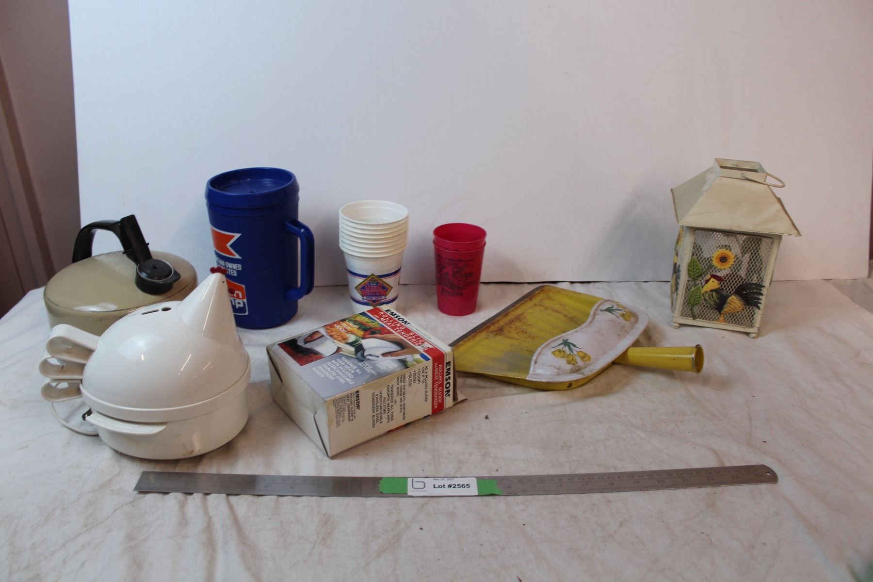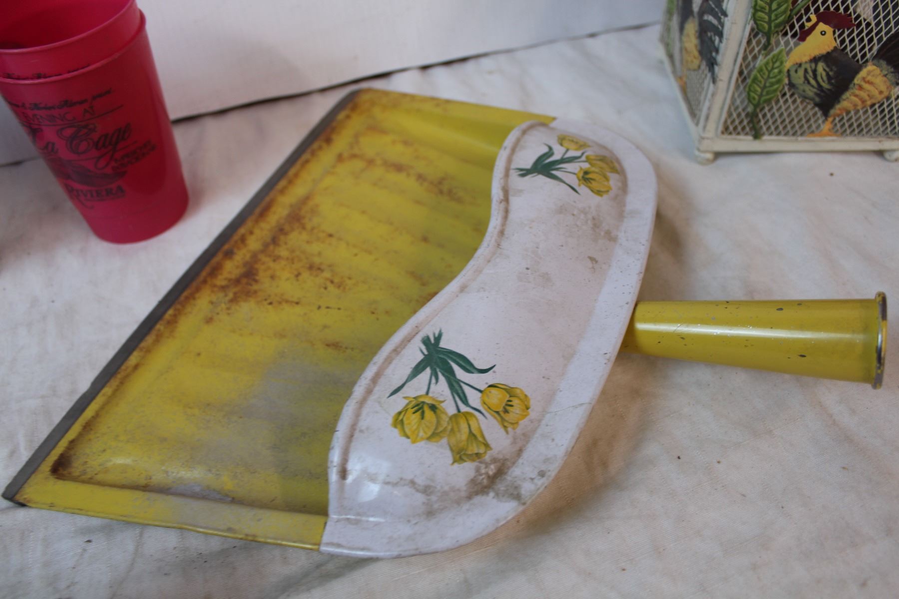 misc. Items; chicken shaped egg cooker, vintage dust pan, plastic cups