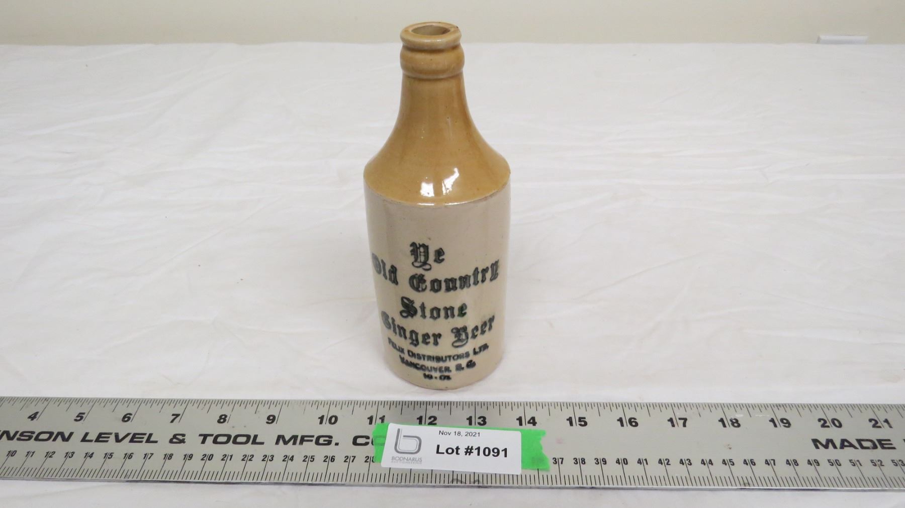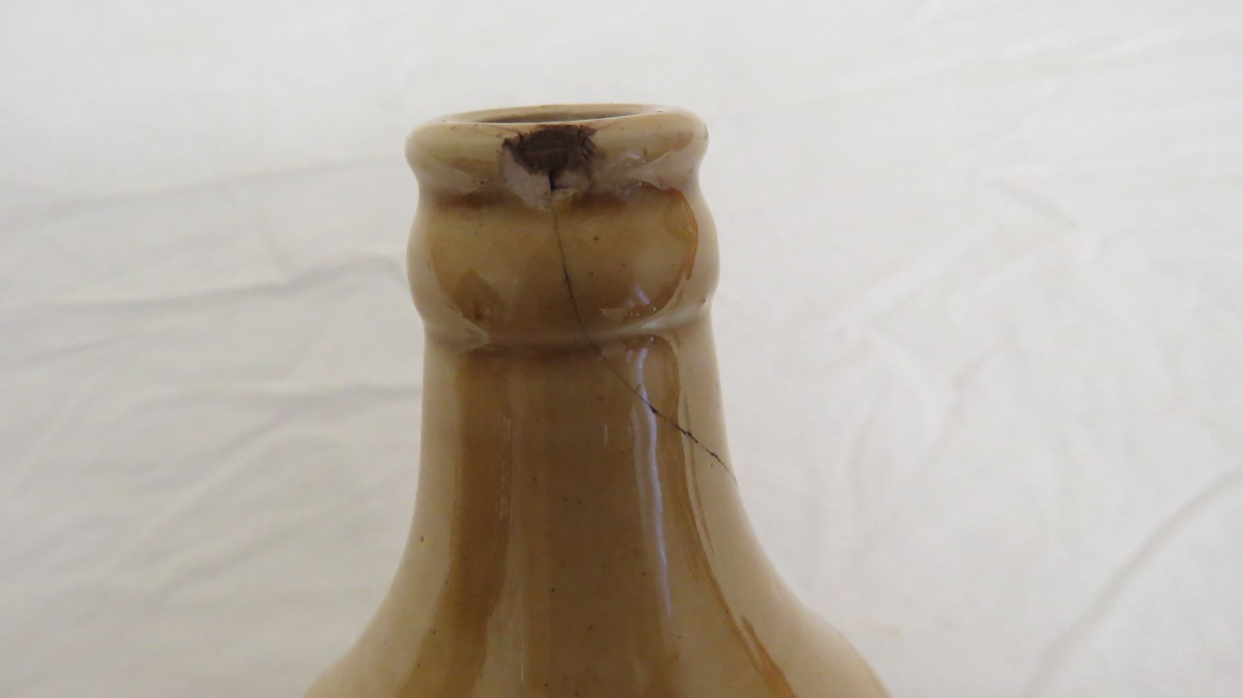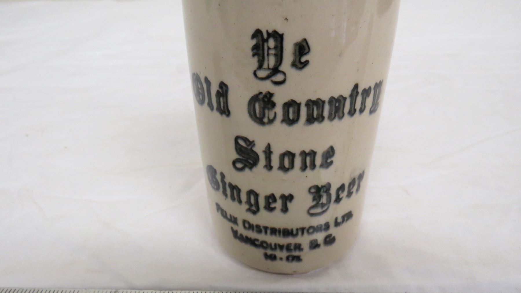 old country store ginger beer stoneware bottle 10oz - vancouver BC (has chip + small hairline crack on top)