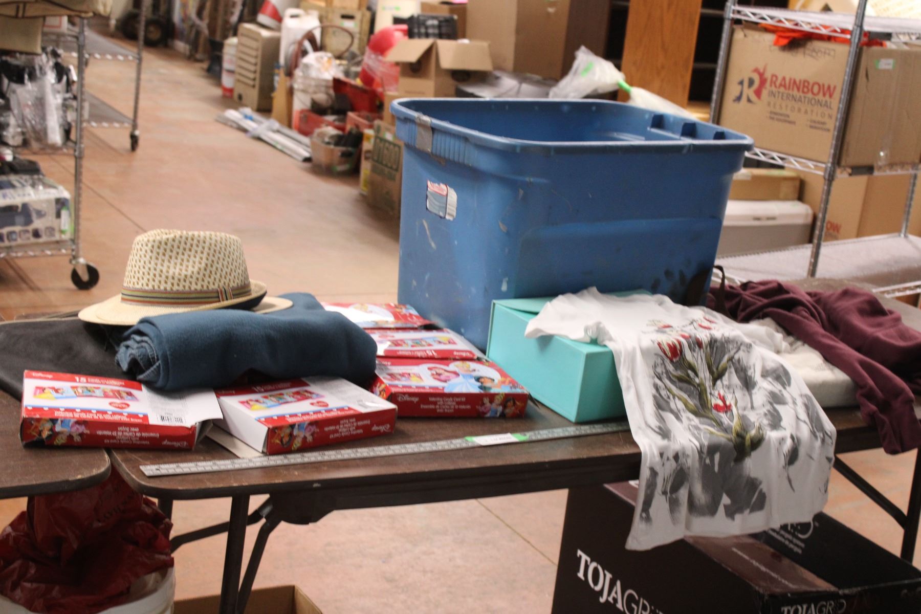 plastice tote with clothing + misc