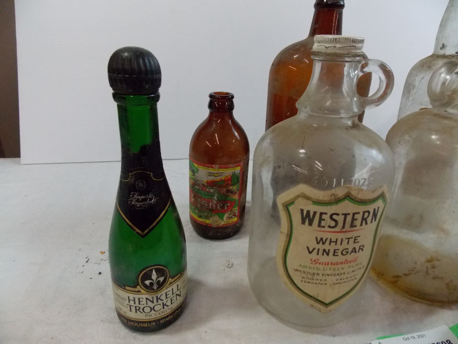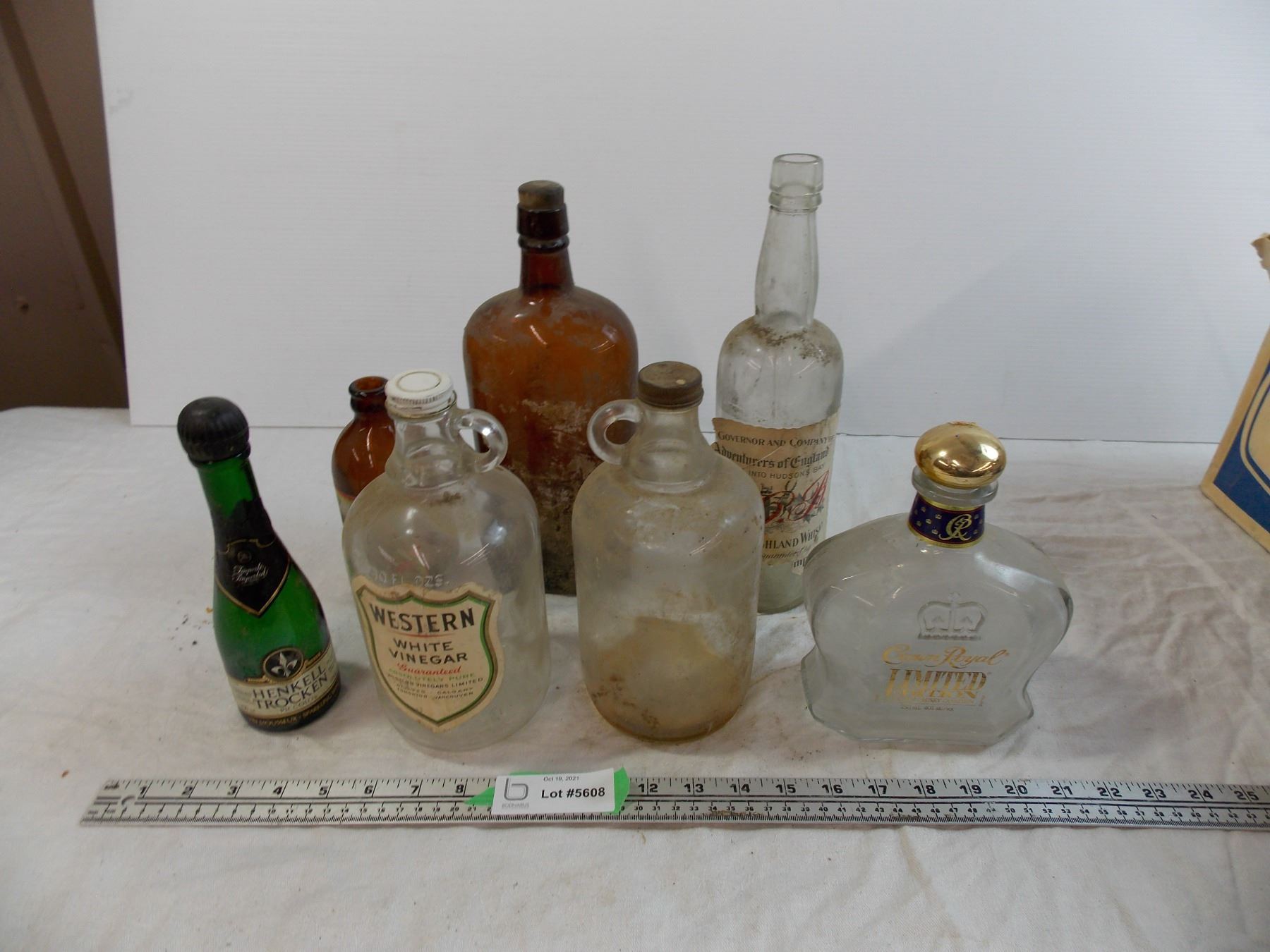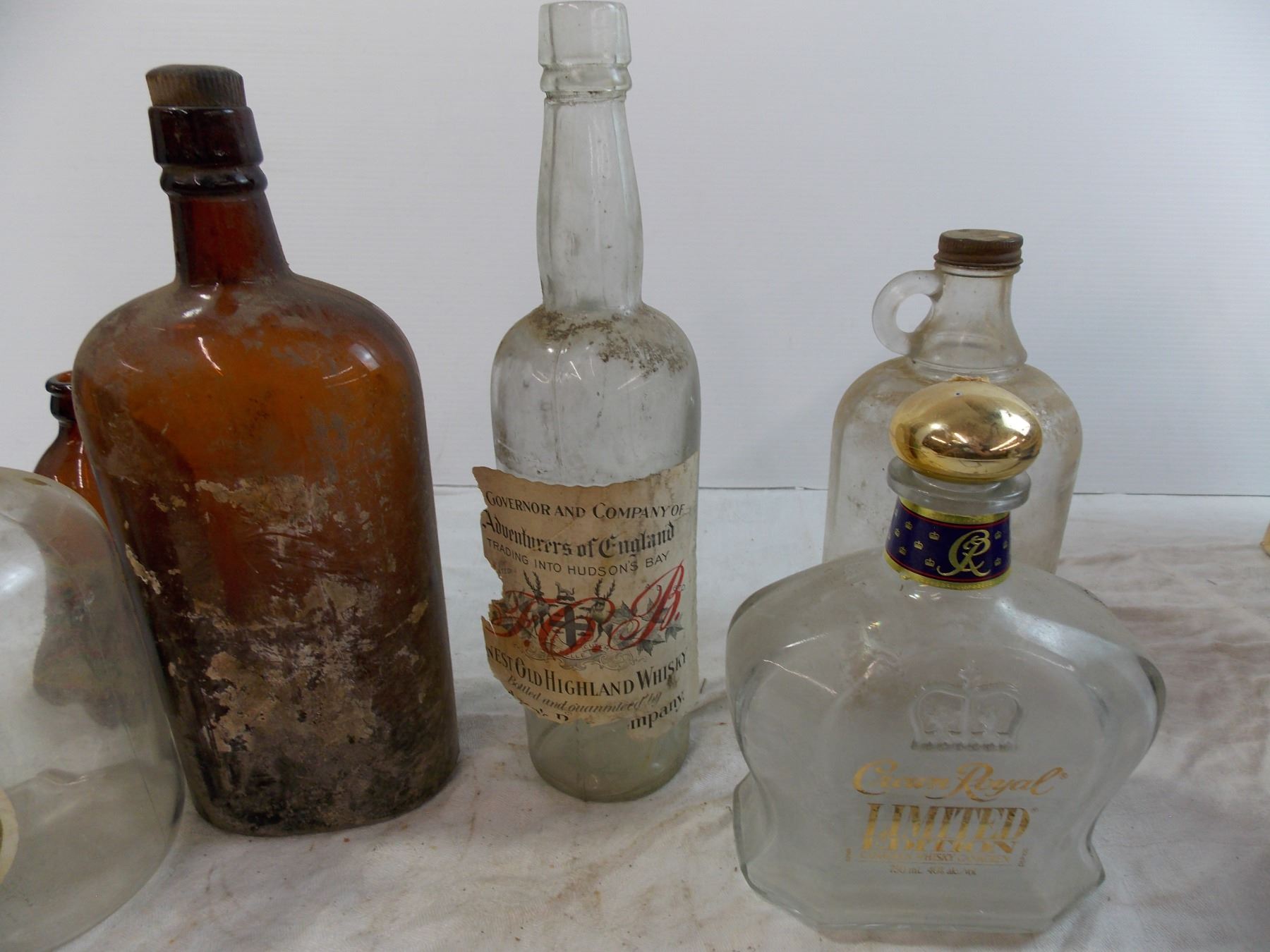 various vintage bottles, white binegar, crown royal, misc