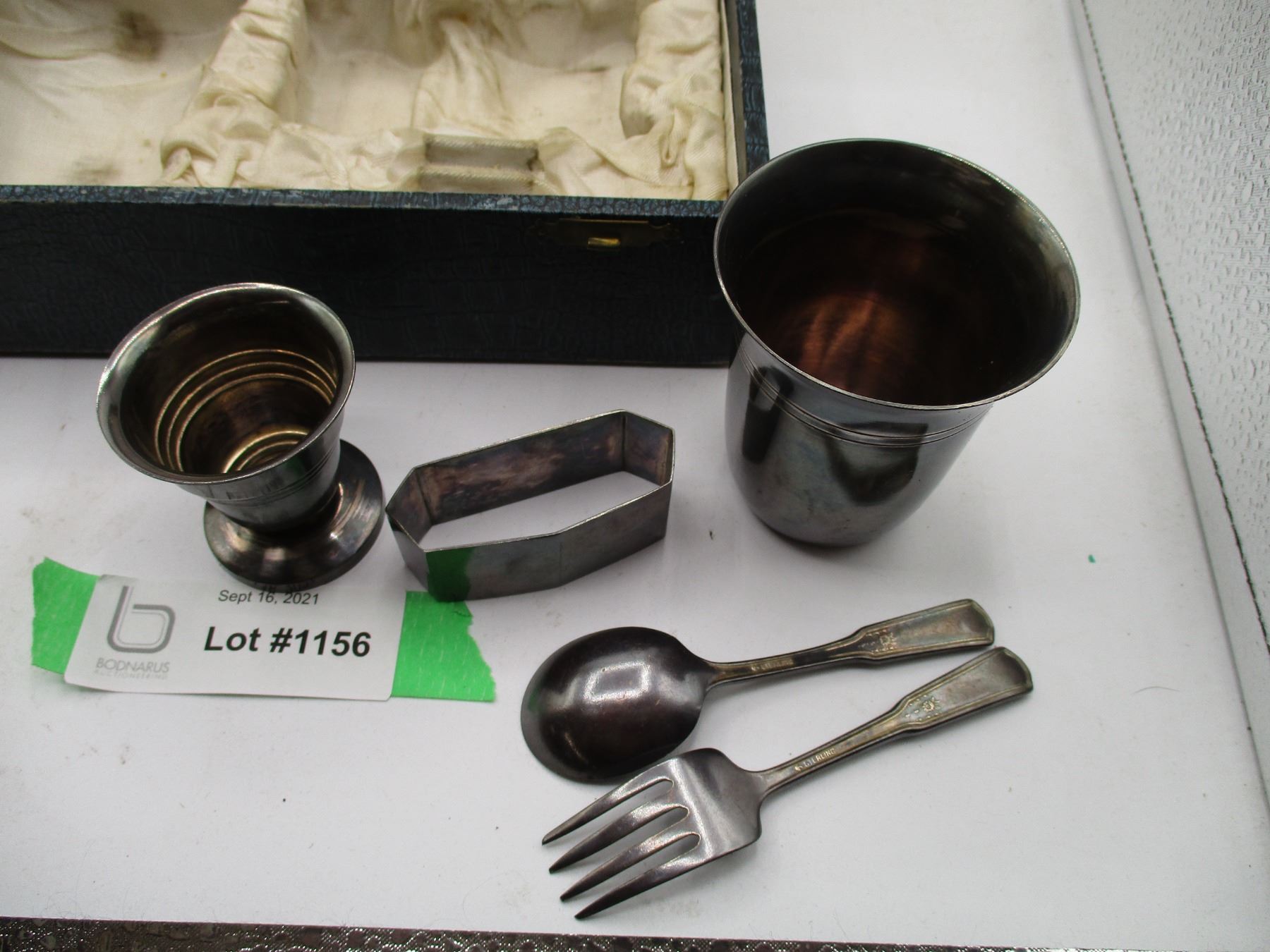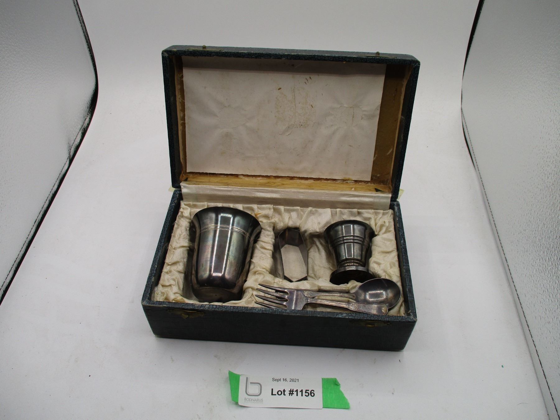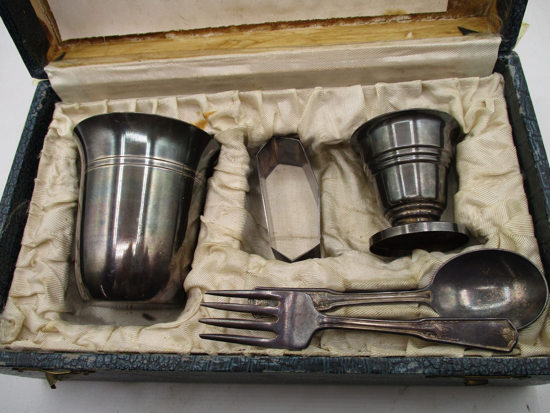 vintage childrens breakfast set - fork + spoon stamped, sterling, other pieces stamped MB-2, 3 and 2or5 in original box