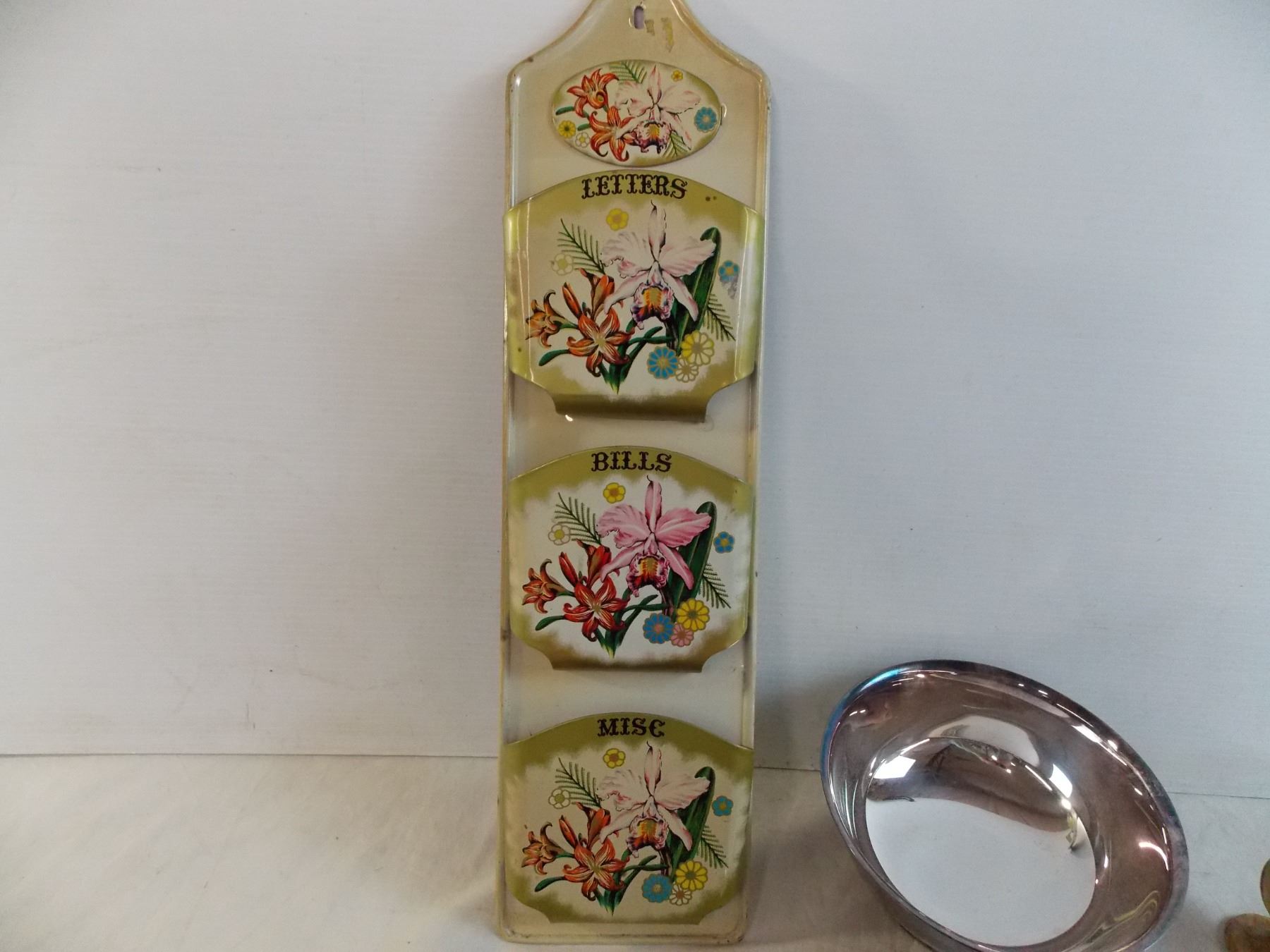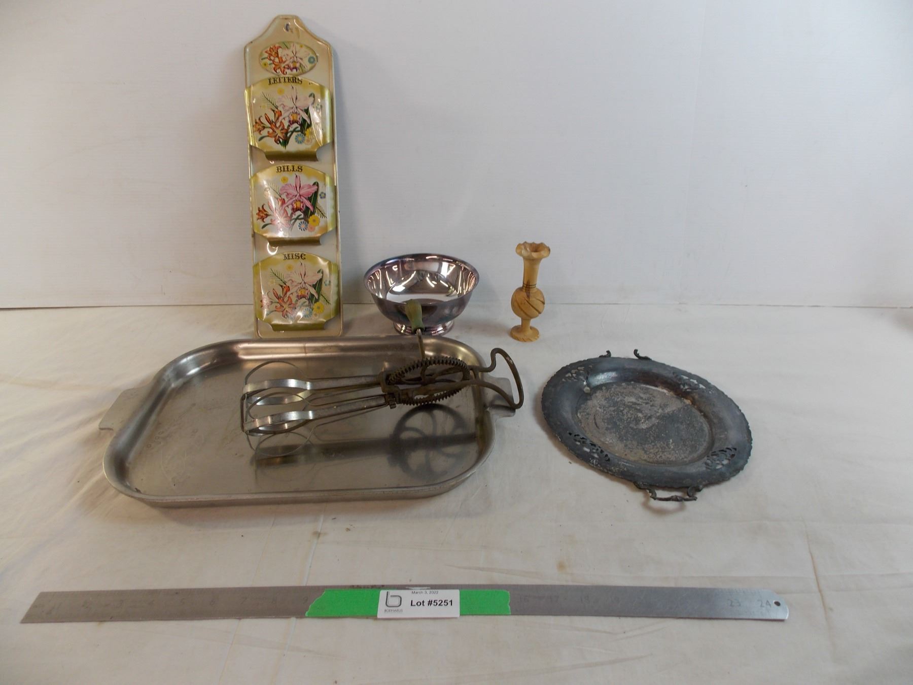 vintage letter tin, egg beater, misc silver plated (Gorham bowl)