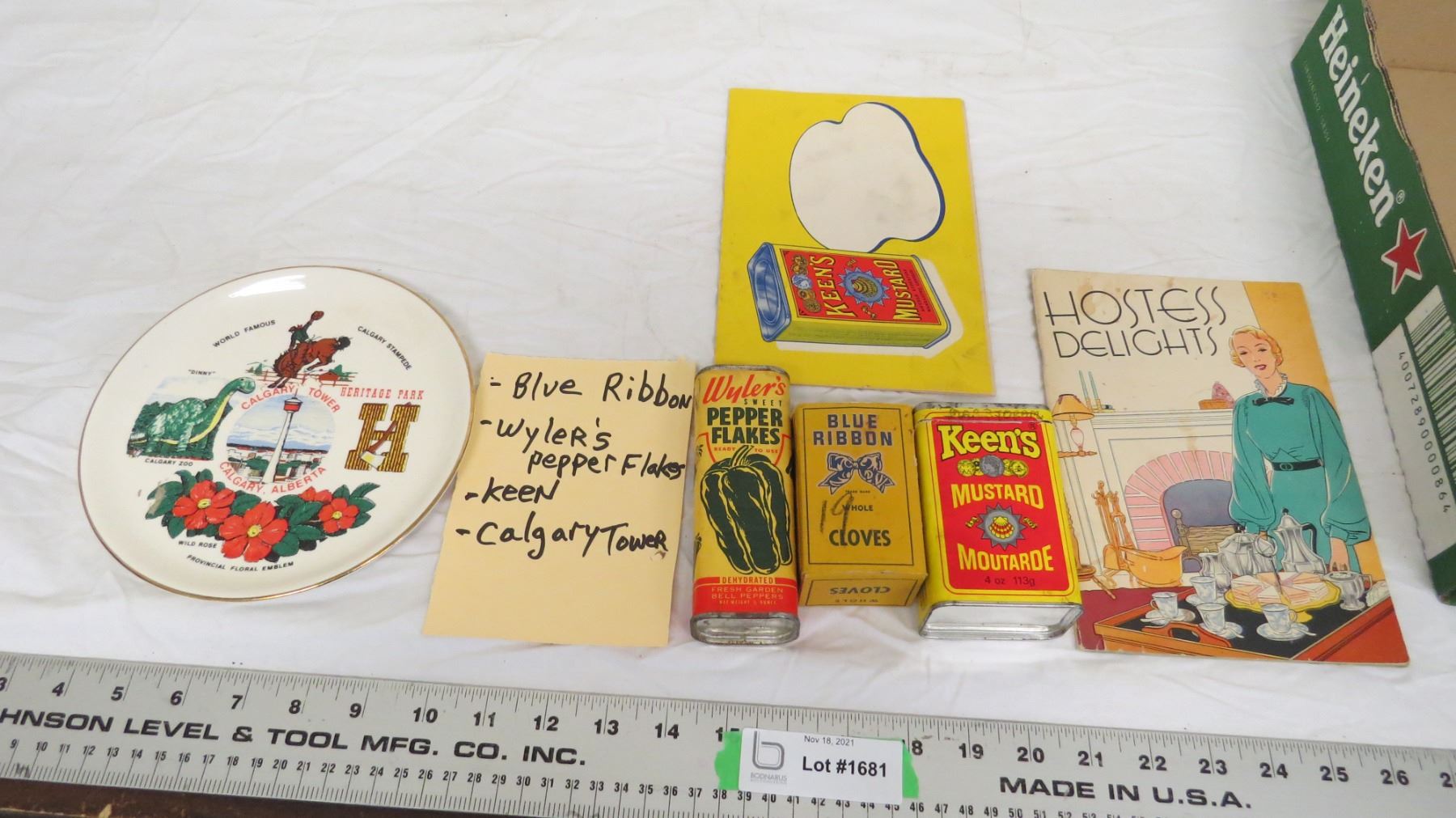 vintage spice tins, keons mustard recipe book, calgary collector plate