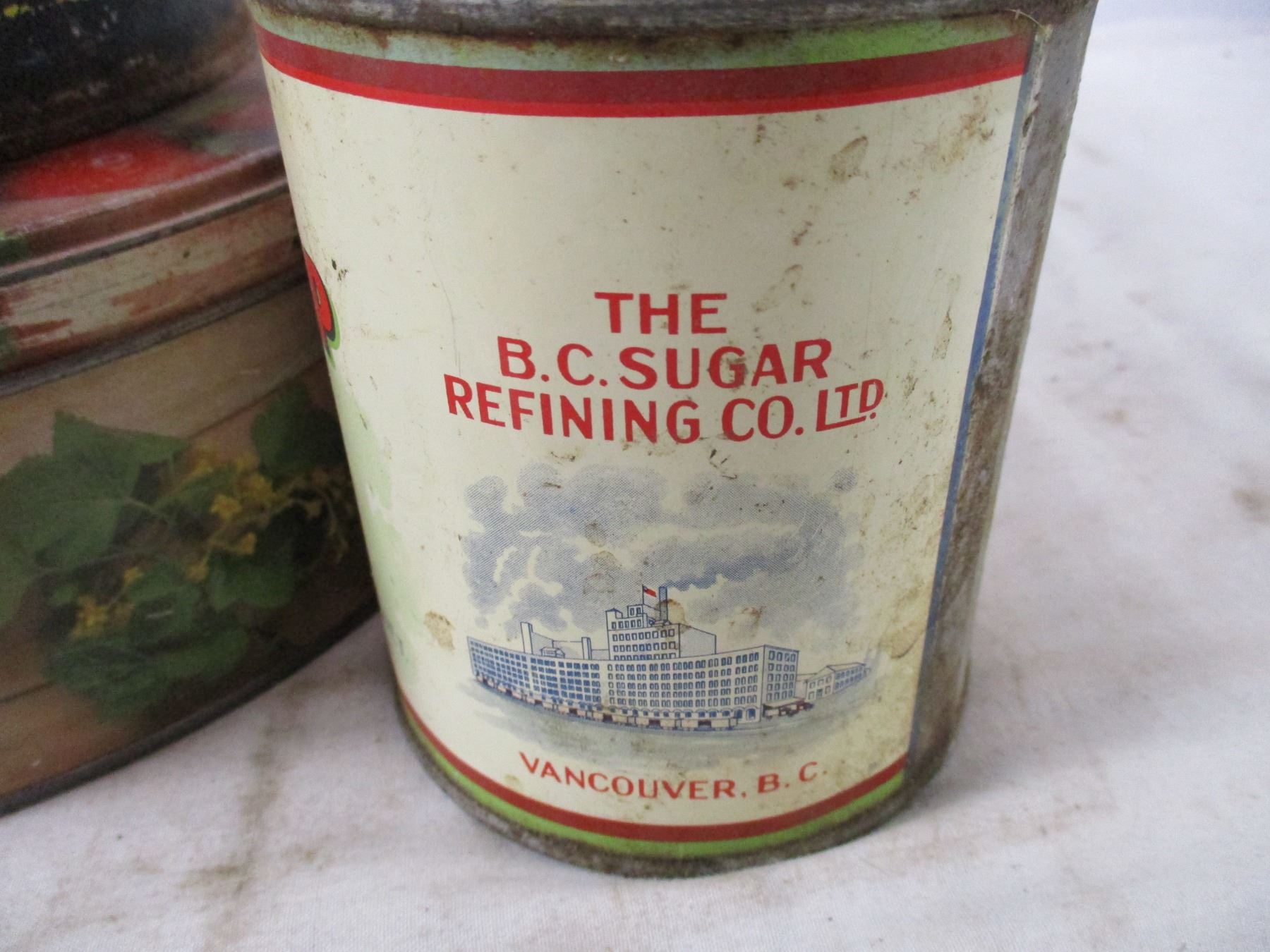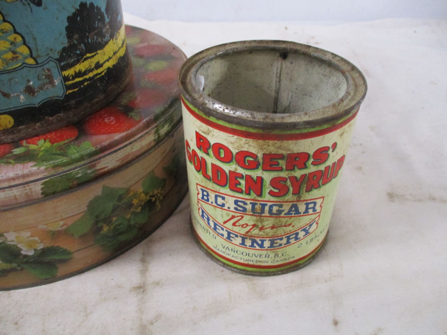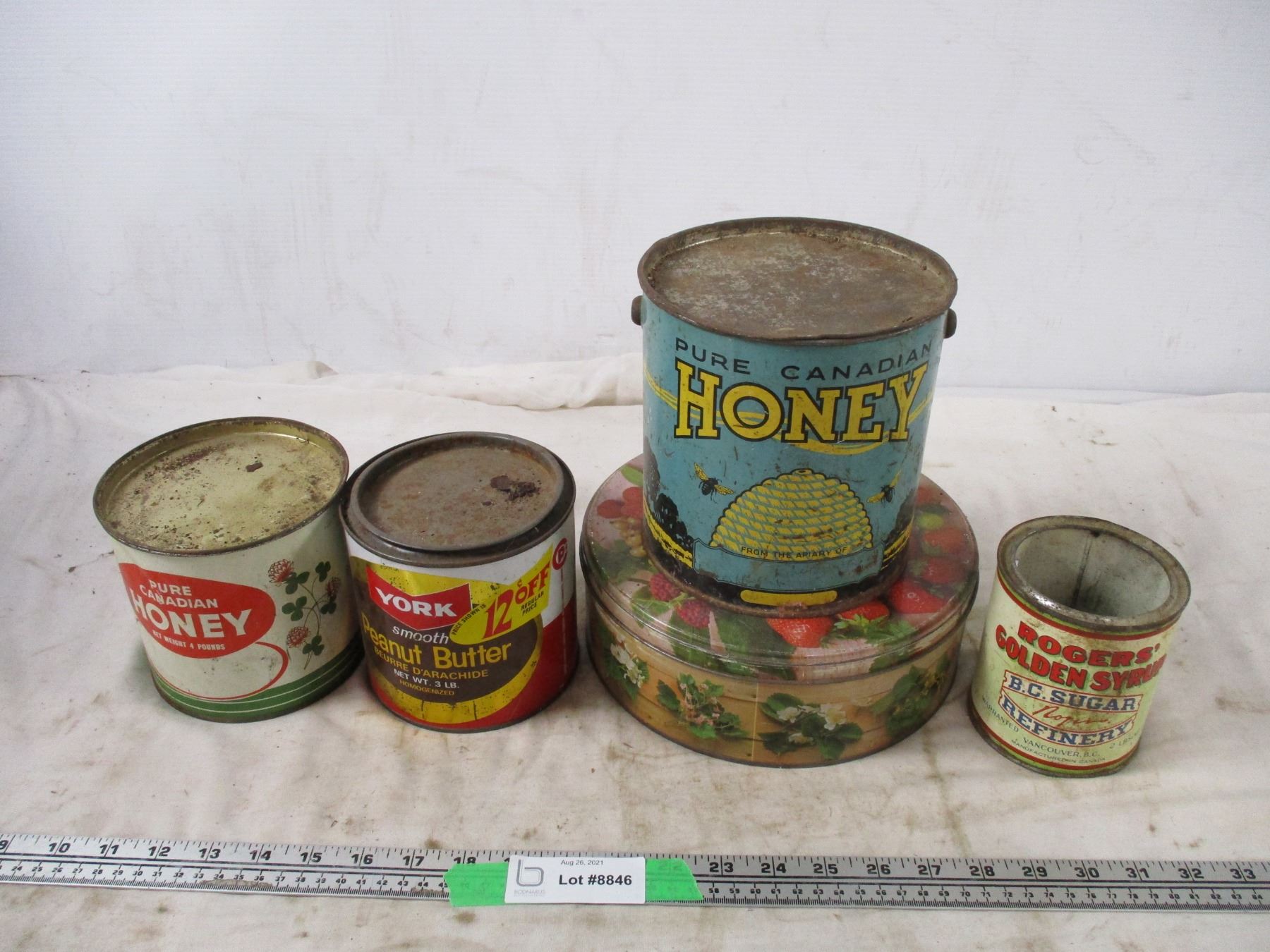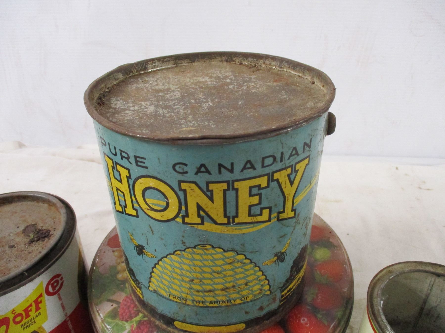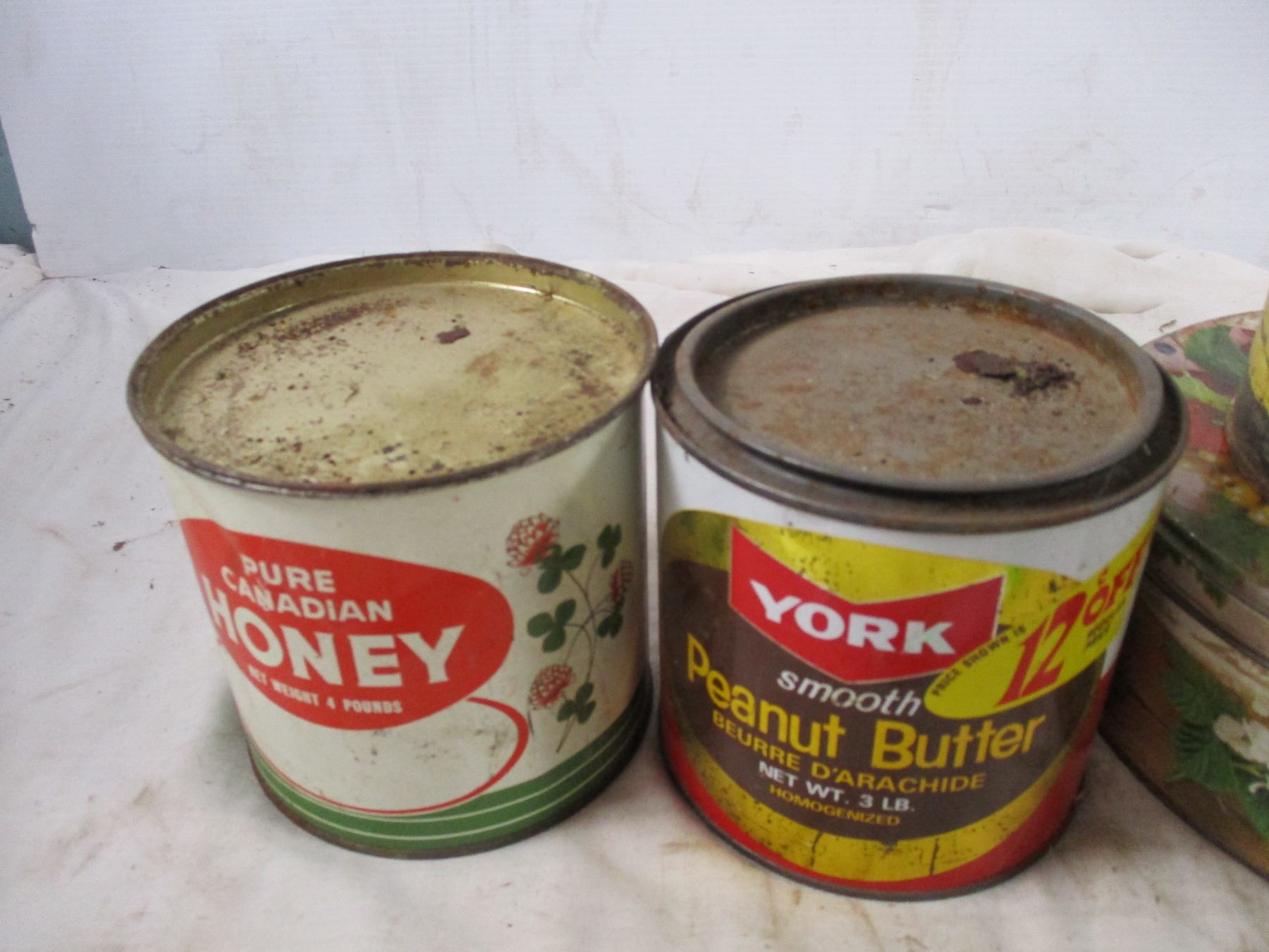 york peanut butter tin, honey tins + other tins